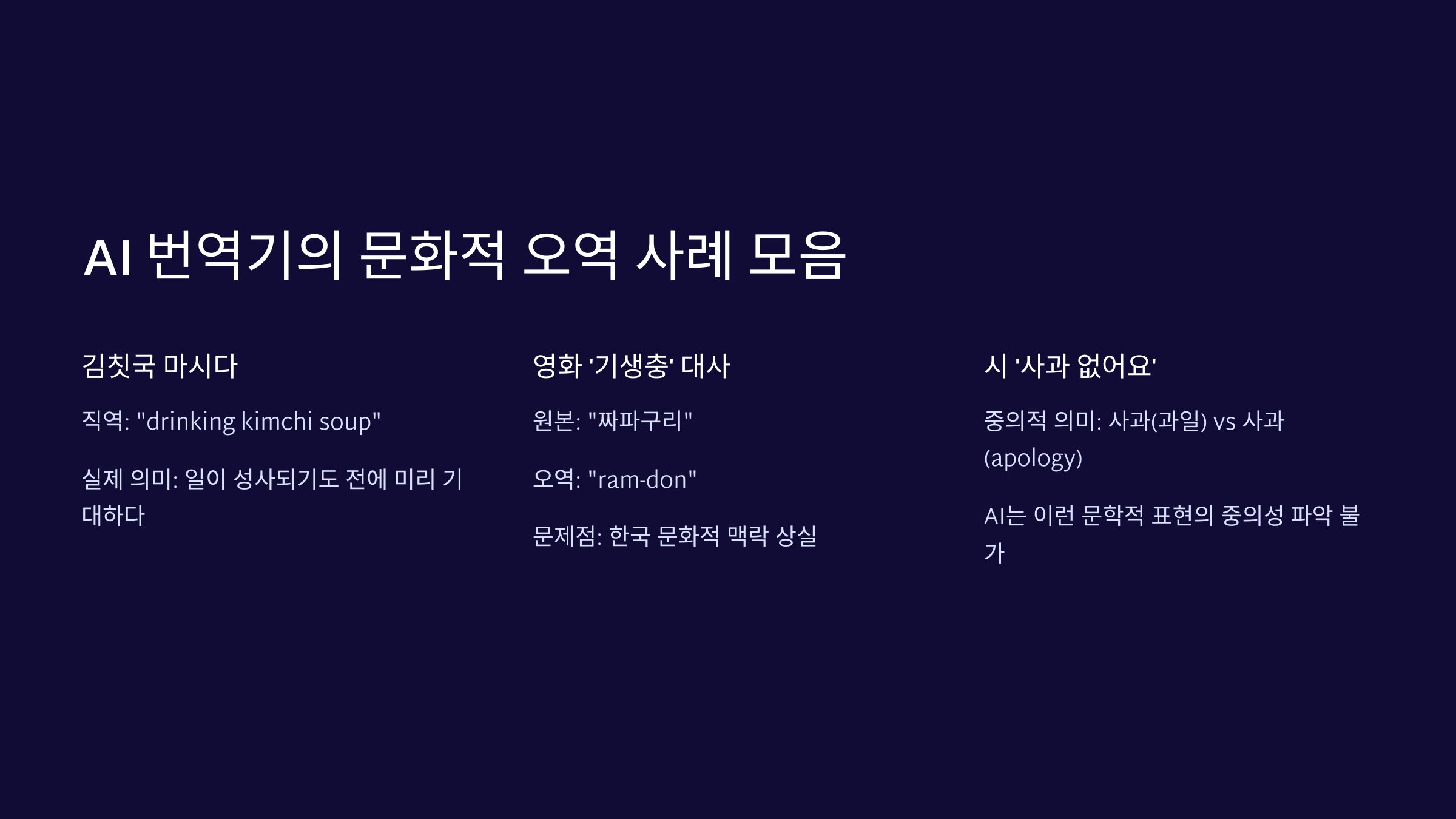 다음으로, AI 번역기의 문화적 오역 사례를 살펴볼게요. 🏛