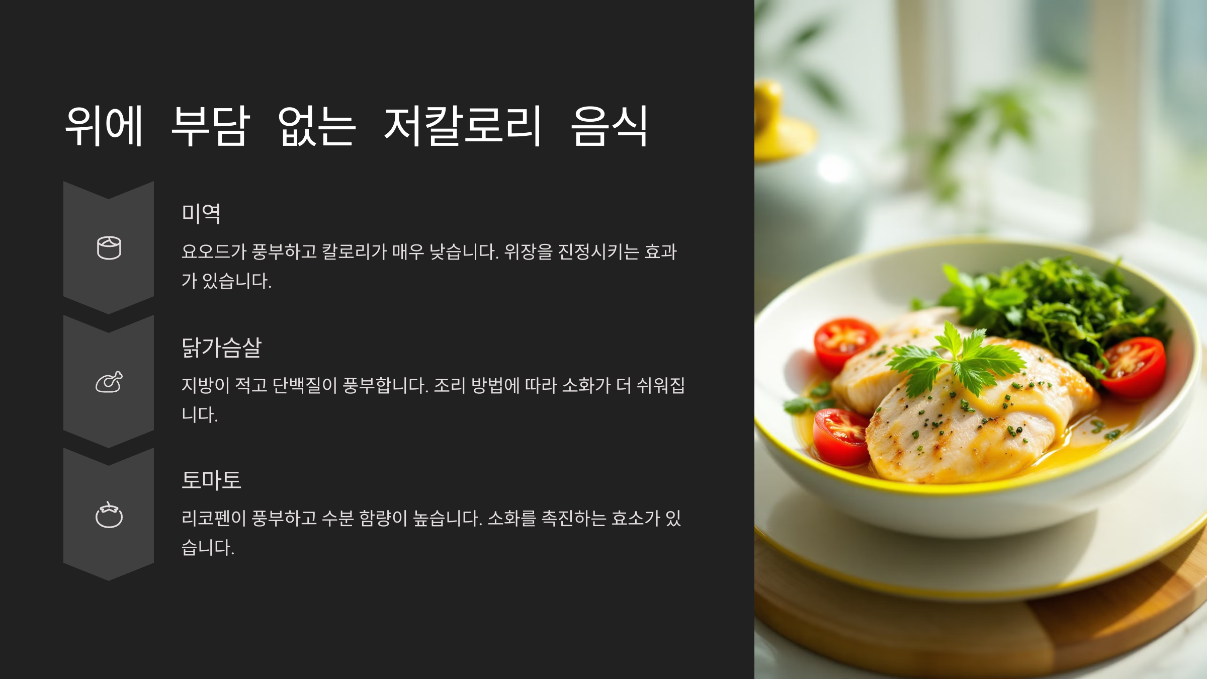 저칼로리이면서도 위에 부담이 없는 음식으로는 오이🥒, 애호박🥗, 양배추🥬, 브로콜리🥦, 닭가슴살🍗, 연두부 등이 있어요. 이들은 소화가 쉽고 포만감이 오래 지속되며, 장 건강에도 도움을 줘요.