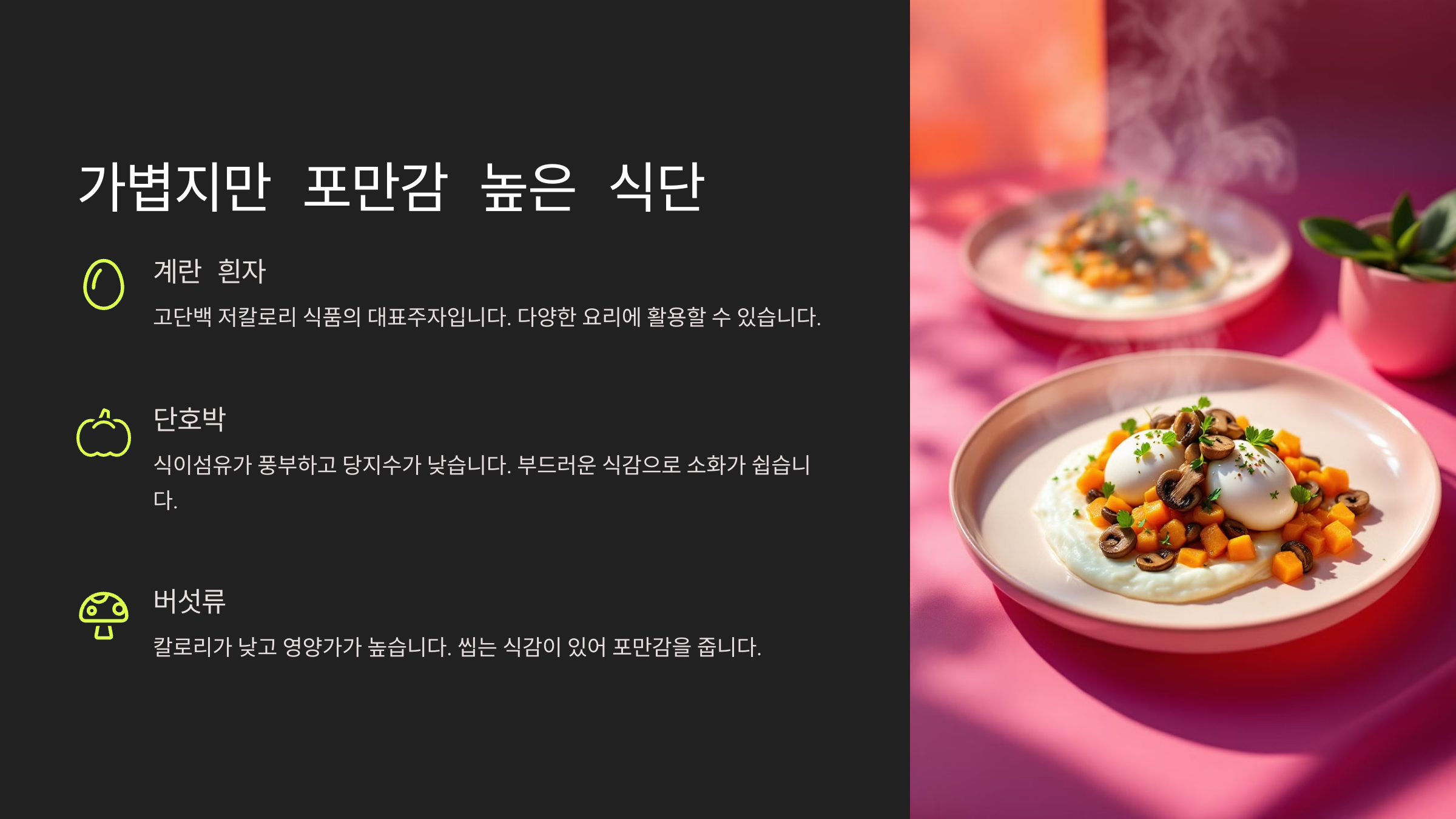 저칼로리 음식은 다이어트뿐만 아니라 건강에도 좋아요. 위에 부담을 주지 않으면서도 가볍게 먹을 수 있는 식단을 꾸려보는 건 어떨까요? 😊