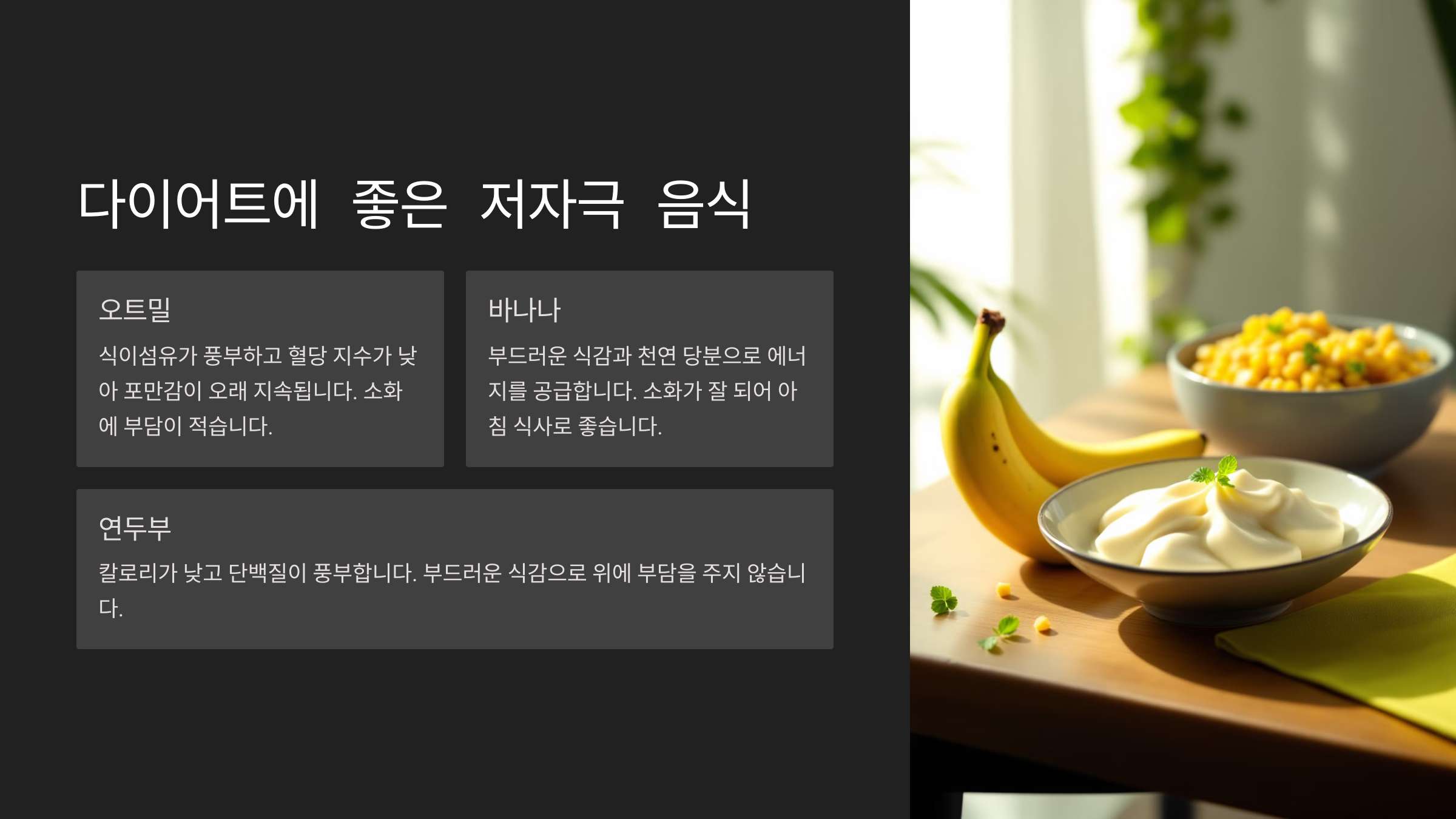 저자극이면서도 다이어트에 도움이 되는 음식으로는 바나나🍌, 삶은 감자🥔, 단호박🎃, 오트밀🥣, 고구마🍠, 두부🧈 등이 있어요. 이들은 위를 부드럽게 감싸주고, 소화가 잘되면서도 포만감을 오래 유지해 준답니다.