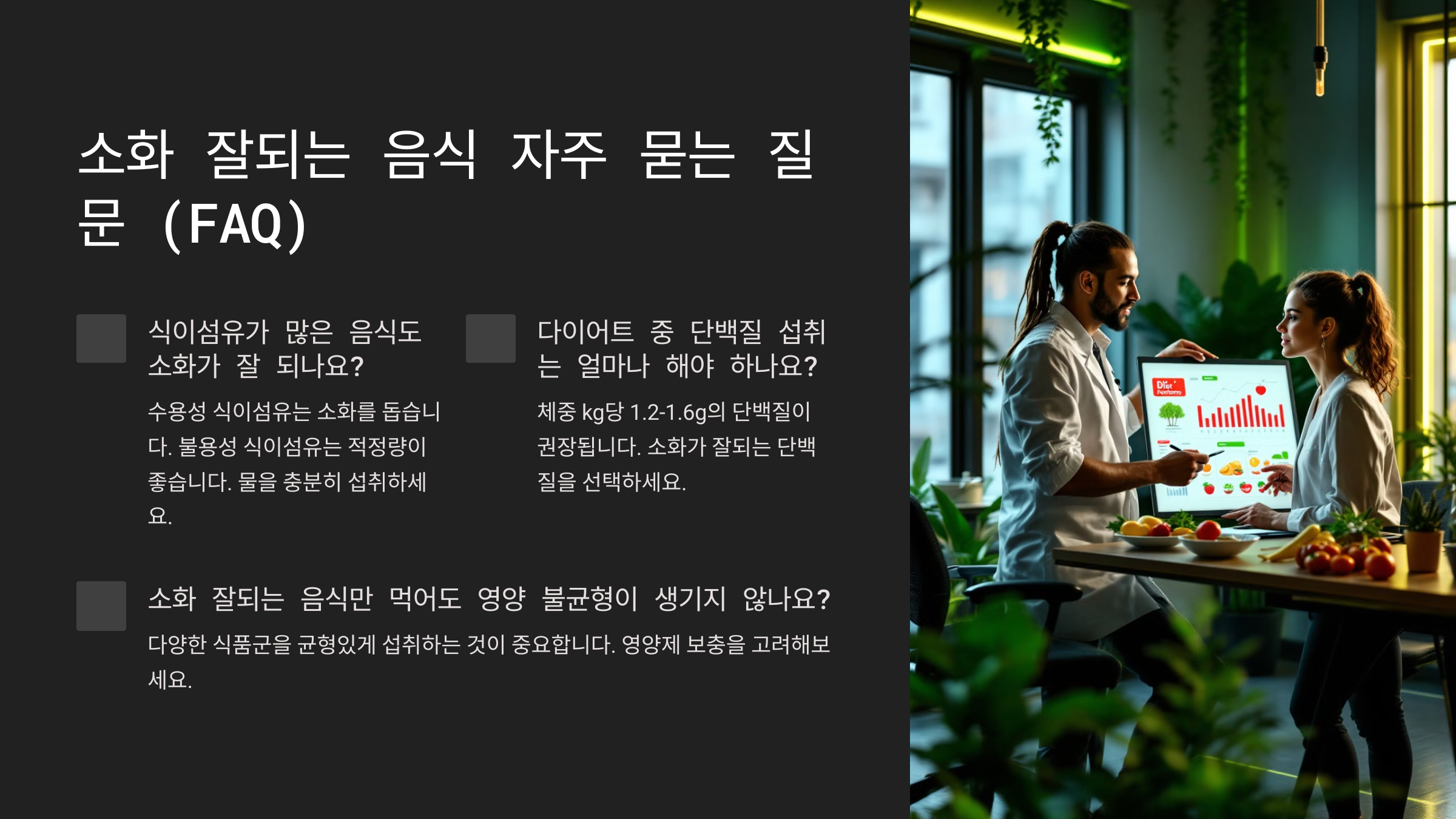 또한, 요거트 + 견과류 + 바나나 같은 조합도 속을 편안하게 하면서도 포만감을 유지할 수 있어요. 이렇게 식단을 다양하게 구성하면 영양소를 고르게 섭취하면서도 소화가 잘되도록 도울 수 있어요!