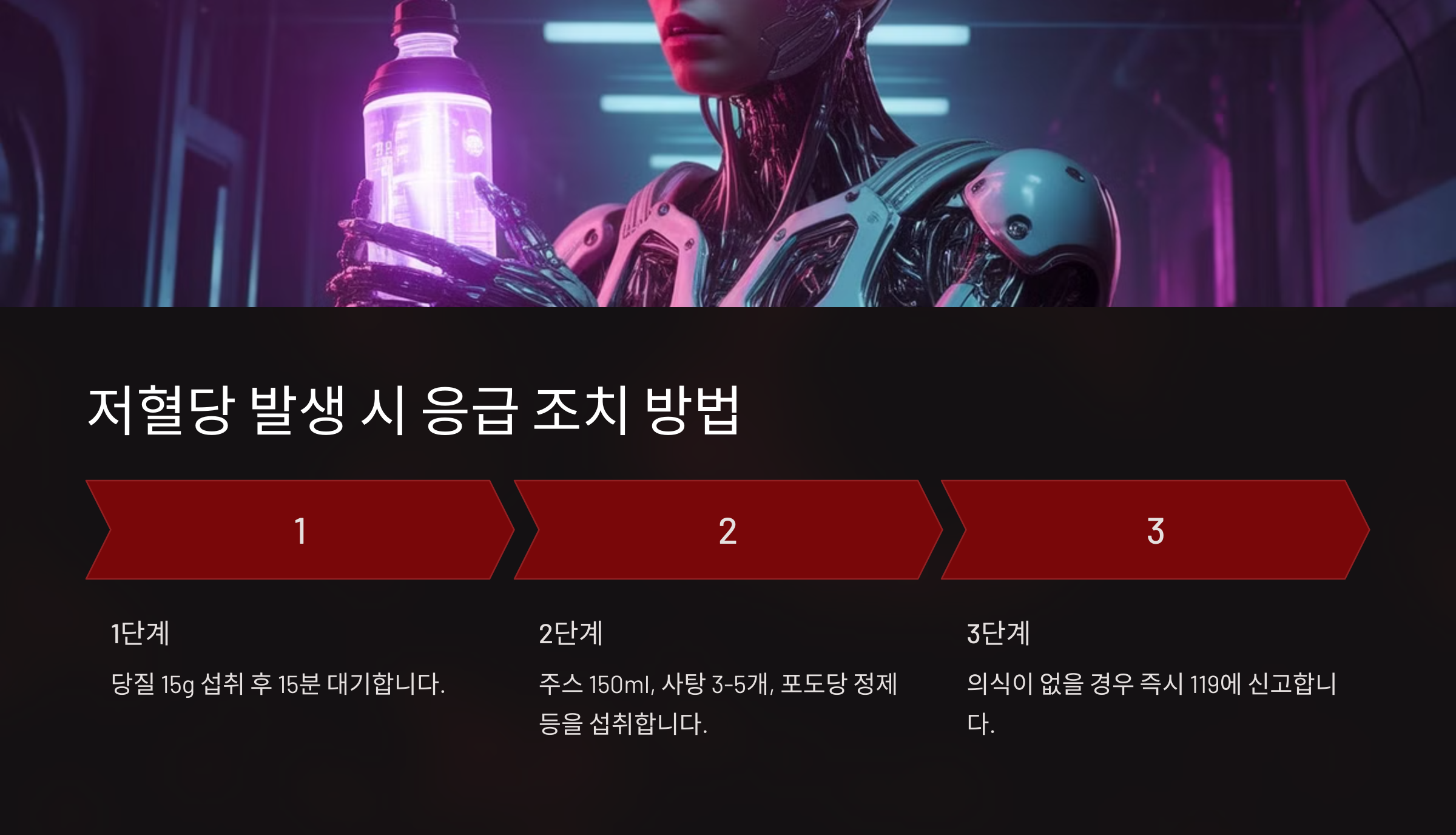 ⚠ **위급 상황일 때 꼭 기억하세요!** - 의식이 없거나 음식 섭취가 어려우면 **즉시 119에 연락!** 🚑 - 주변 사람이 있다면 글루카곤 주사(Glucagon Injection)를 요청하세요.