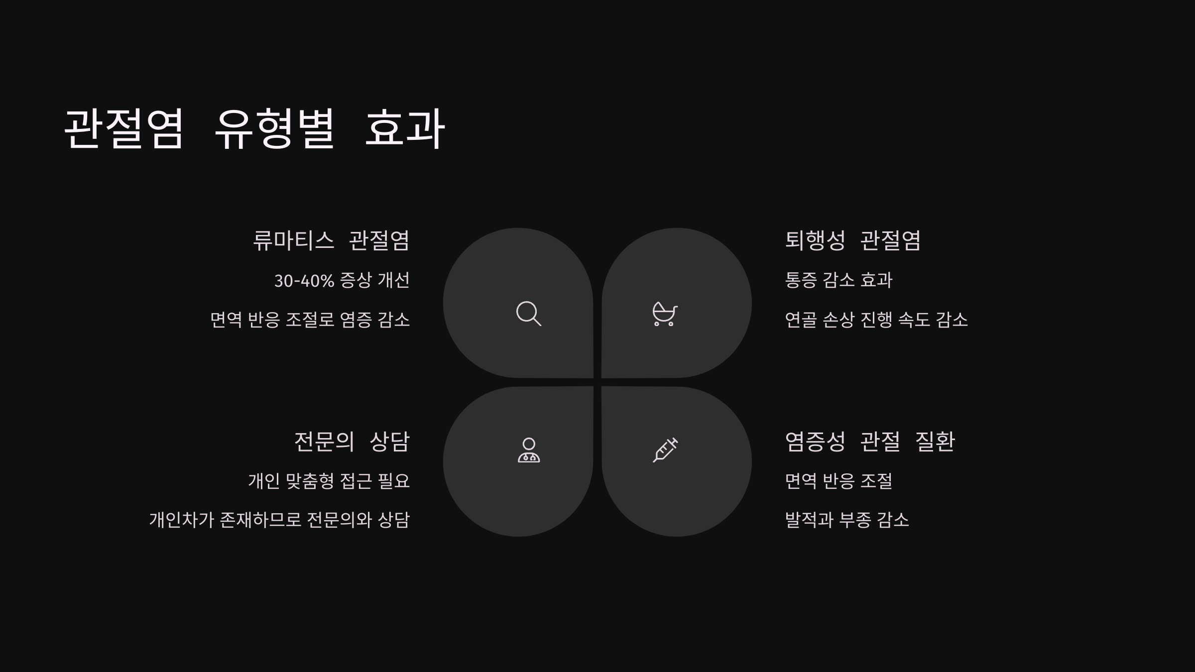 | 퇴행성 관절염 | 노화, 과사용 | 연골 보호, 염증 억제 |