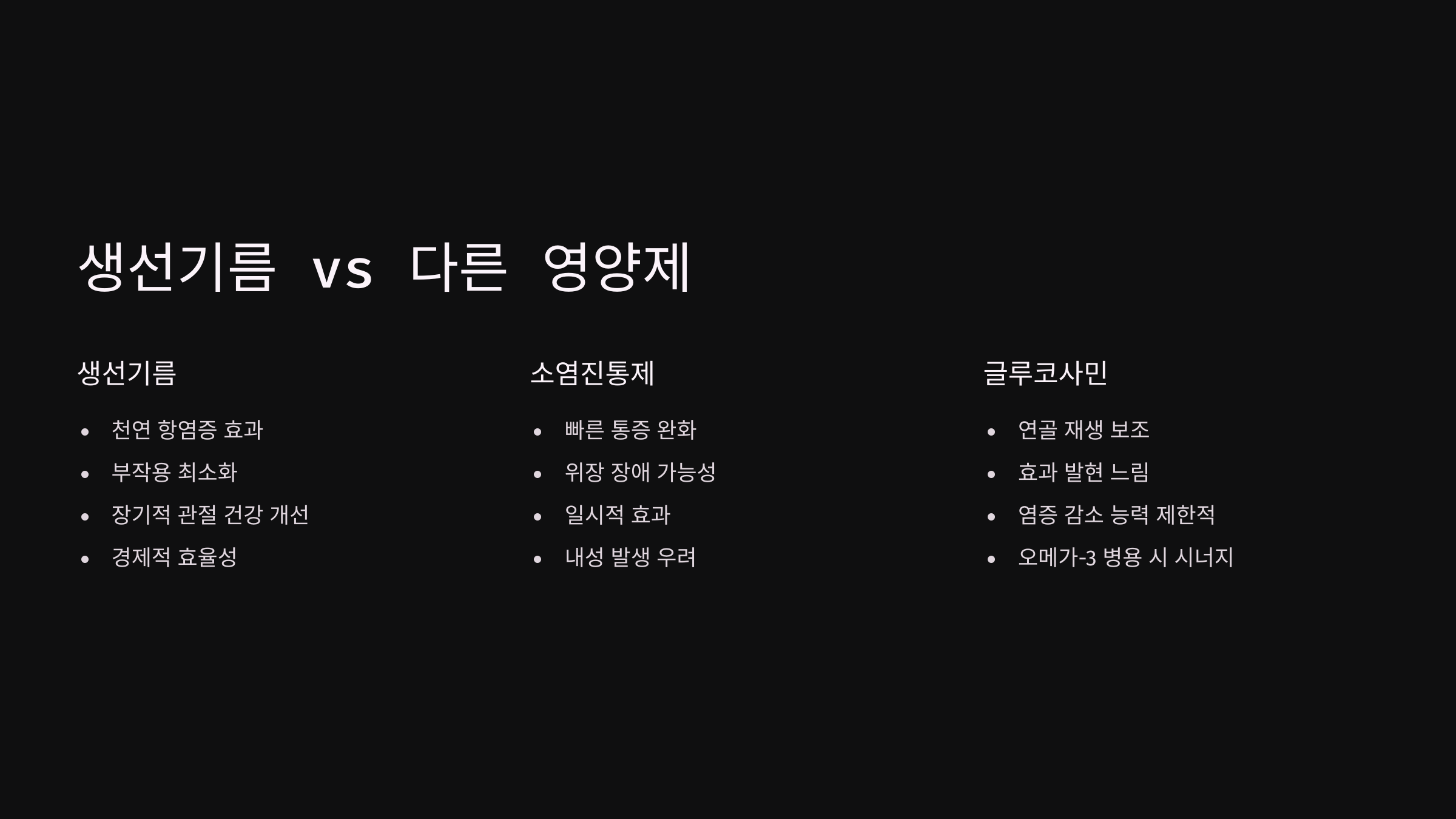 | 글루코사민 | 연골 형성 | 복구 기능 중심 |