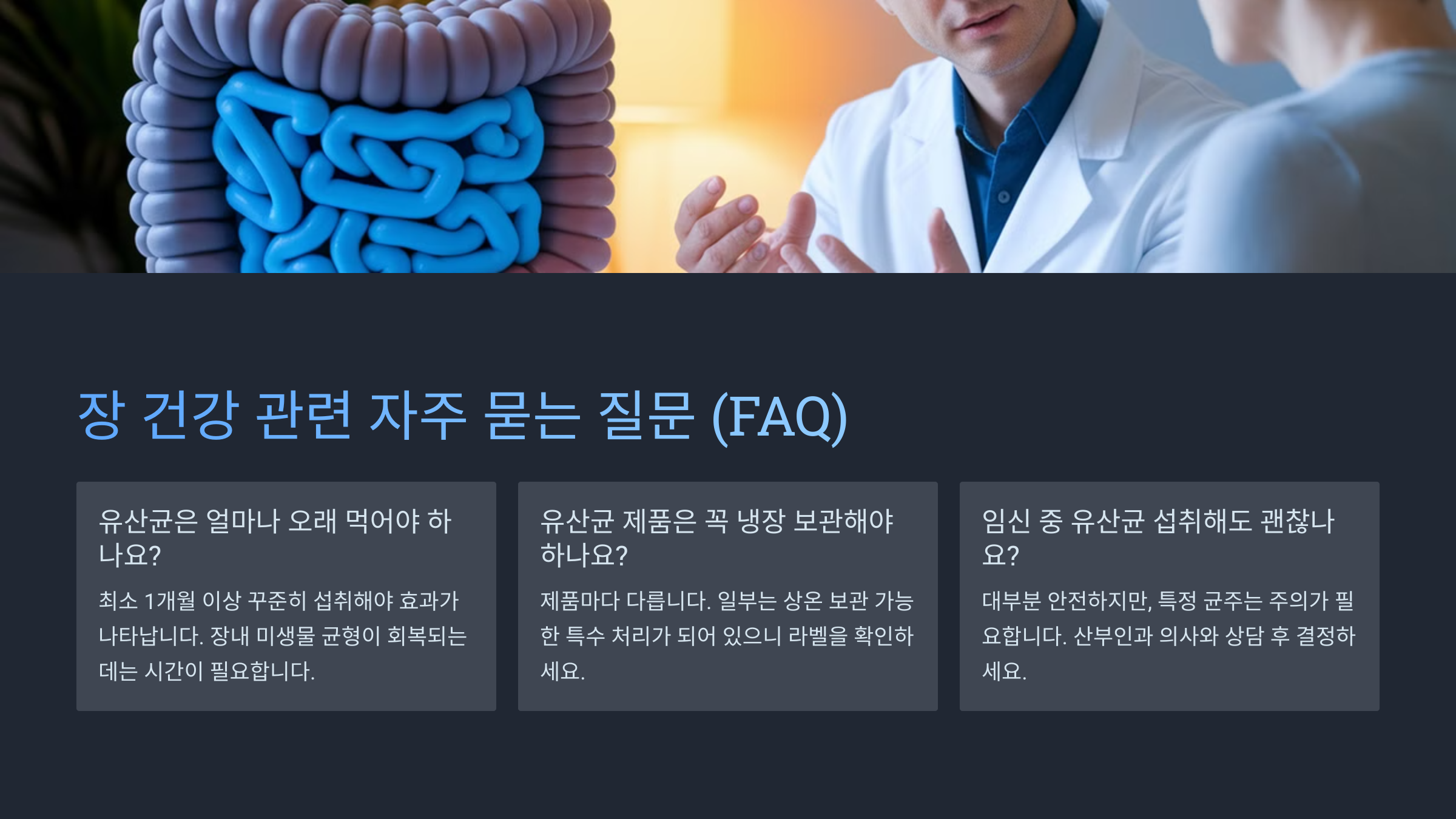 📢 다음 섹션에서는 유산균과 장 건강에 대한 자주 묻는 질문(FAQ)을 알아볼게요!