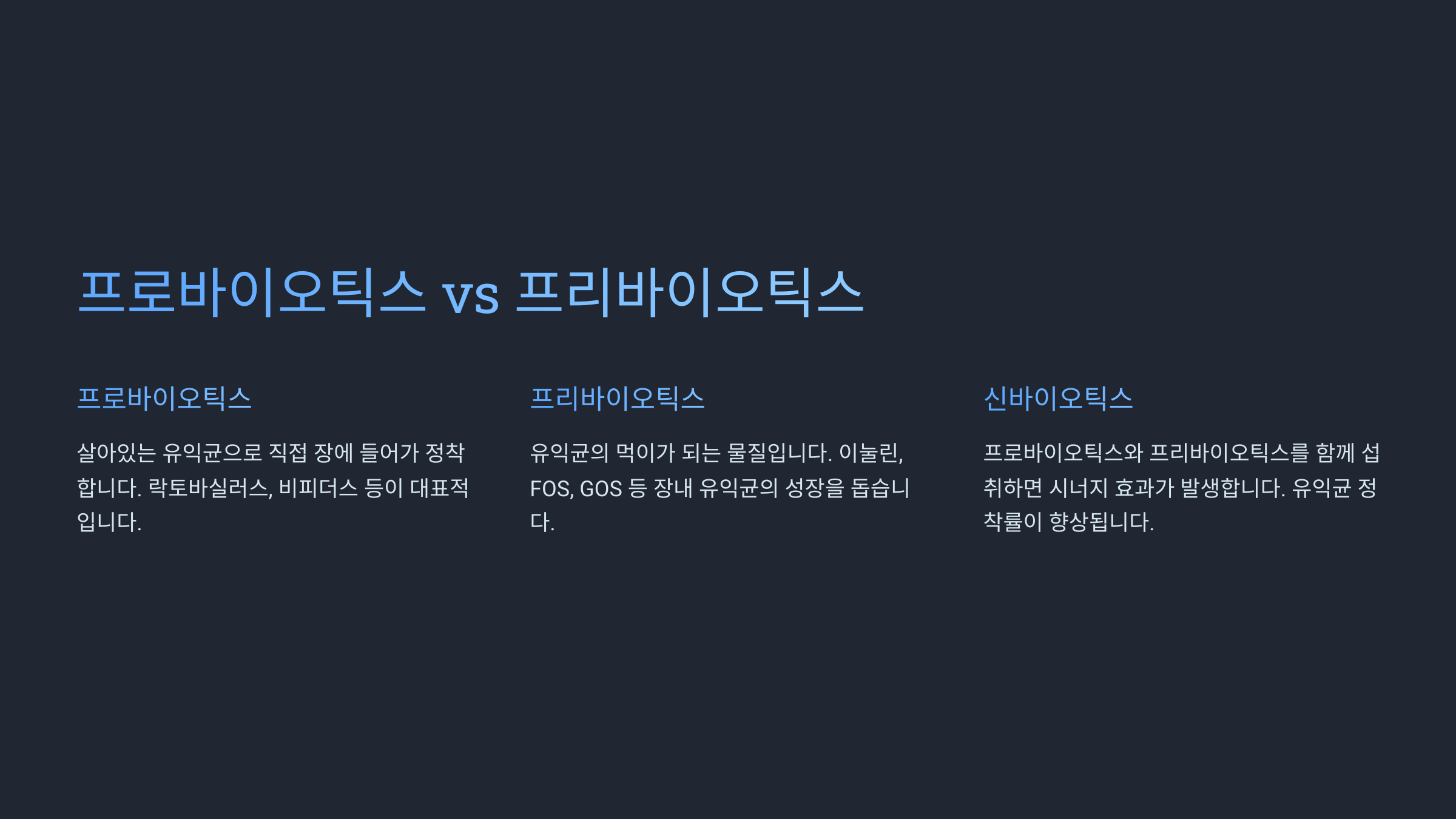 많은 사람들이 프로바이오틱스와 프리바이오틱스를 혼동하는데, 이 둘은 엄연히 다른 개념이에요. 프로바이오틱스는 장에 좋은 살아 있는 유산균을 의미하고, 프리바이오틱스는 유익균의 먹이가 되는 성분을 뜻해요.