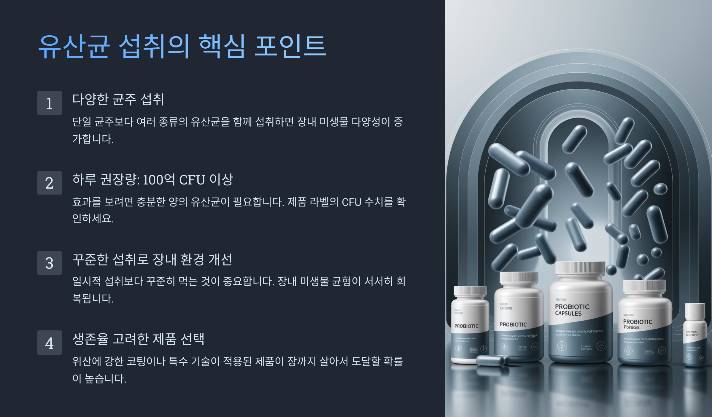 유산균을 제대로 섭취하려면 몇 가지 중요한 포인트를 기억해야 해요. 가장 중요한 것은 장까지 살아서 도착하는 유산균을 선택하는 것이죠. 장에 도착하기 전에 위산과 담즙에 의해 유산균이 대부분 사멸할 수 있기 때문에 코팅 기술이 적용된 제품을 고르는 것이 좋아요.