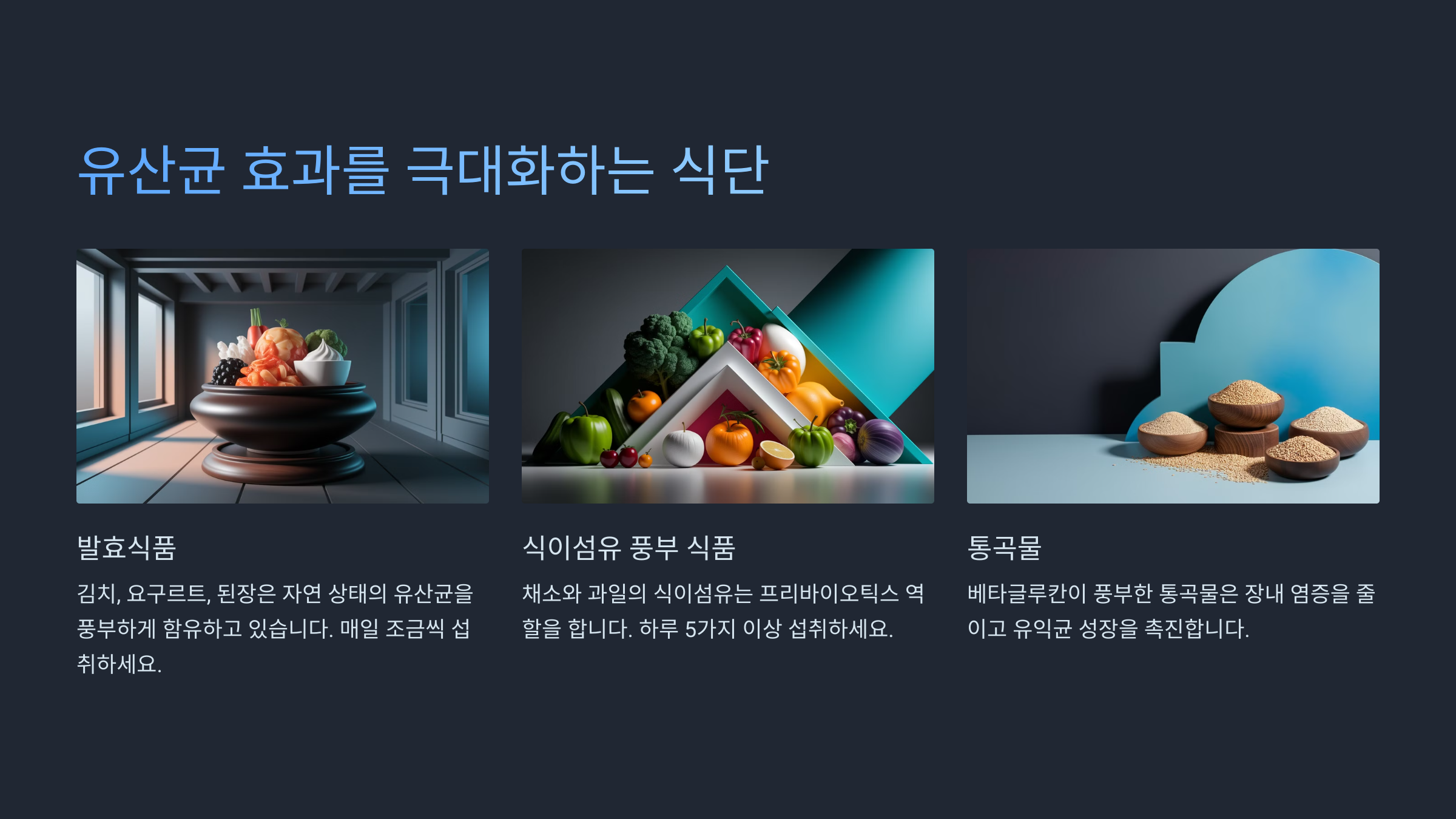 📢 다음 섹션에서 유산균 효과를 극대화하는 식단과 유익균이 잘 자라는 환경을 만드는 법에 대해 알아볼게요!