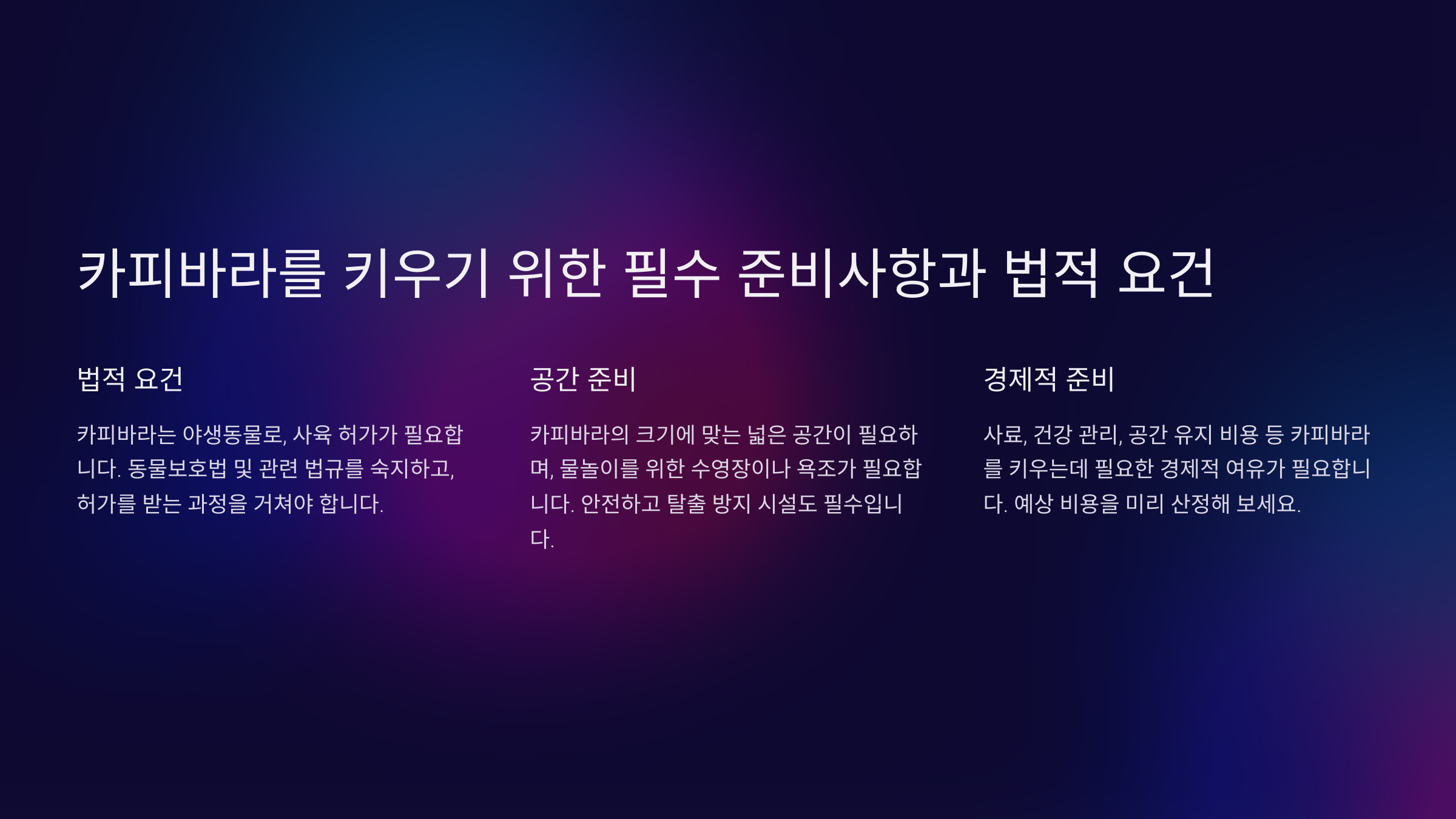 카피바라는 일반적인 반려동물과 다르게 특정한 환경이 필요해요. 반려동물로 키우려면 다음과 같은 조건을 충족해야 해요. 🏡