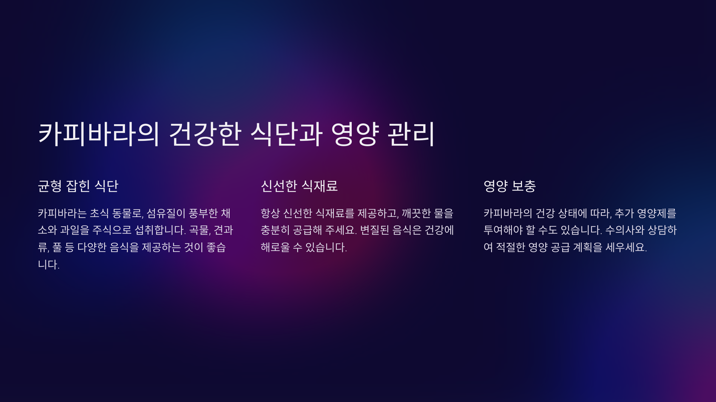 카피바라의 건강을 위해 적절한 음식을 선택하는 것이 중요해요! 다음으로는 카피바라와 함께 지낼 때의 장점과 단점에 대해 알아볼까요? 🤔