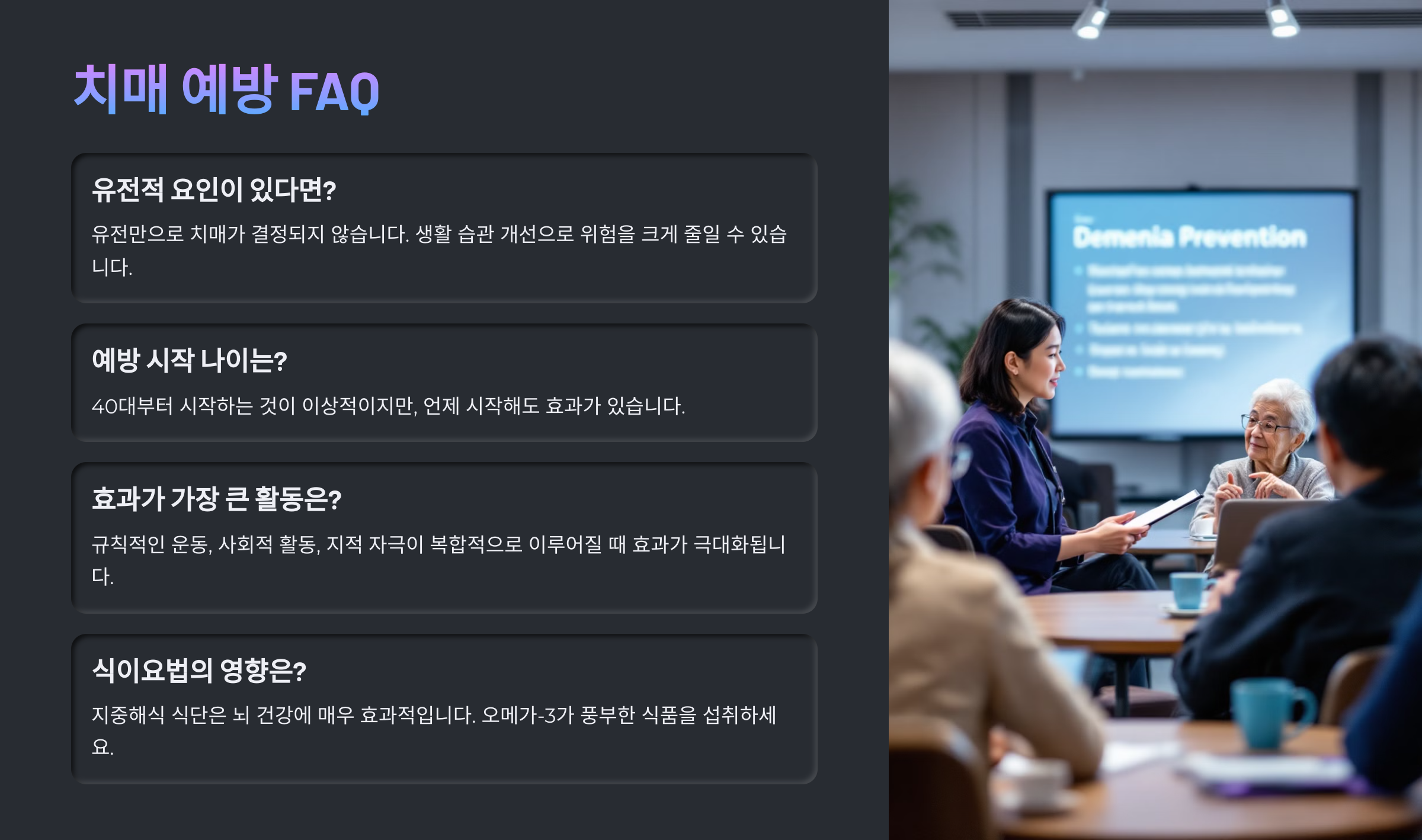 A6. 40~50대부터는 뇌 건강을 위해 예방 습관을 들이는 것이 좋아요. 치매는 아주 서서히 시작되거든요.