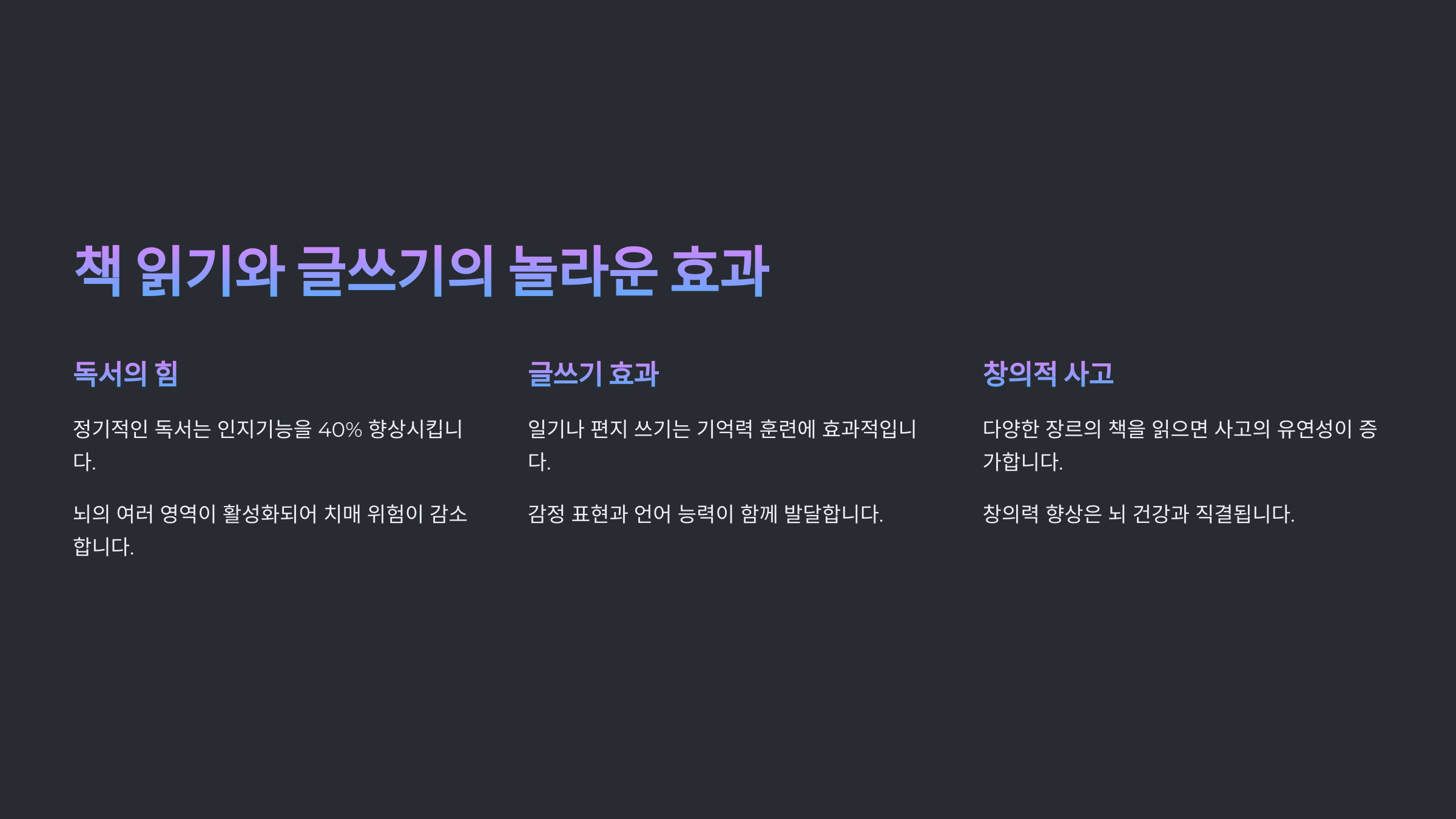 독서와 글쓰기 모두 ‘루틴화’가 중요해요. 일상 속 한 부분으로 자연스럽게 자리 잡으면 더 이상 노력하지 않아도 뇌가 스스로 학습 모드로 들어가요. 이런 습관은 단기적인 효과보다 장기적으로 기억력 유지와 치매 예방에 큰 힘이 되죠.