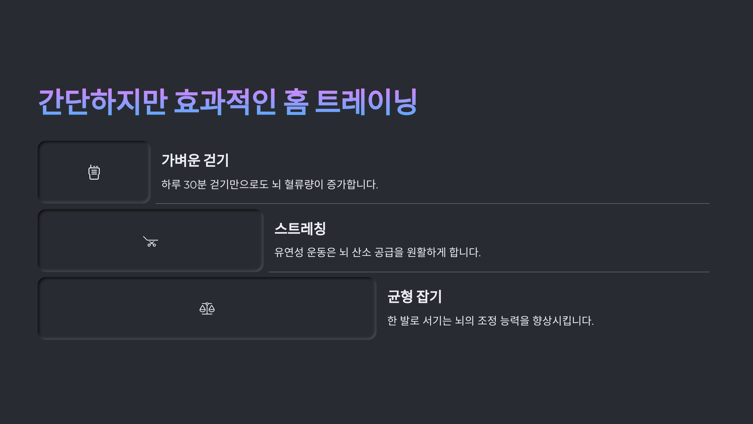 그렇다고 꼭 헬스장에 가야 한다는 건 아니에요. 집에서 할 수 있는 가벼운 동작만으로도 충분히 뇌에 자극을 줄 수 있어요. 간단한 스트레칭, 계단 오르기, 실내 걷기, 맨몸 스쿼트 같은 활동만으로도 효과는 확실하답니다.