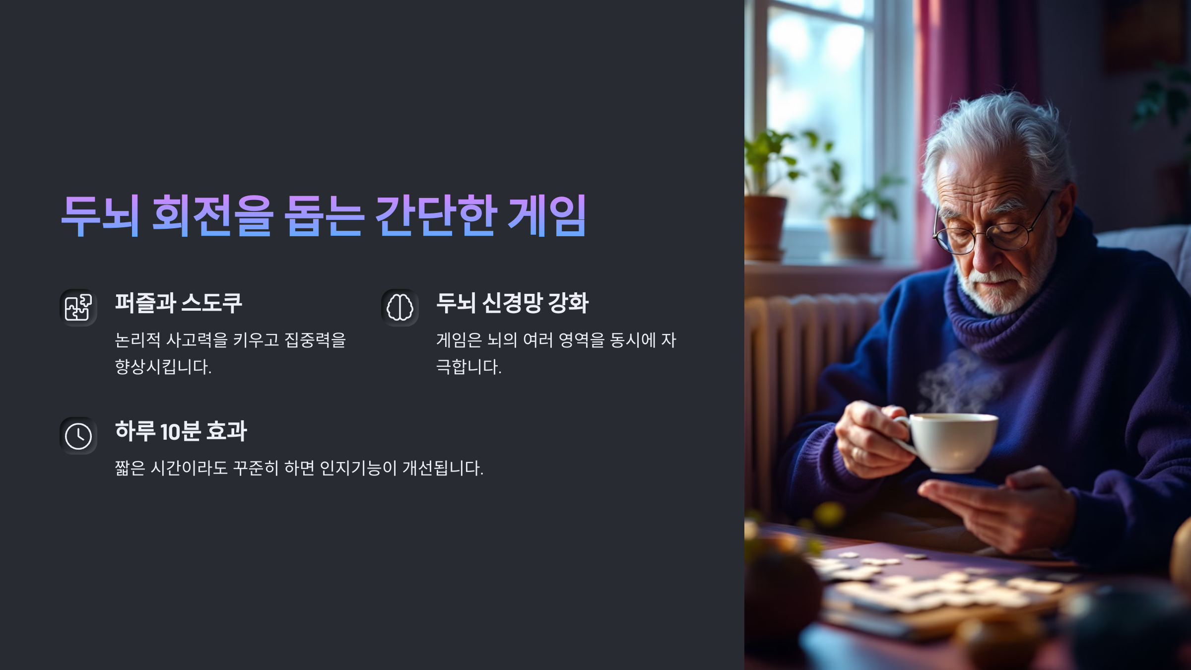 중요한 건 게임의 종류보다는, 얼마나 꾸준히 즐겁게 하느냐예요. 강제로 시키면 스트레스가 되지만, 자발적으로 재미를 느끼며 하게 되면 그 효과는 배가돼요. 두뇌에 자극을 주는 게 아니라, 두뇌가 '즐겁게 춤추는' 시간이 되는 거죠. 💃🧠