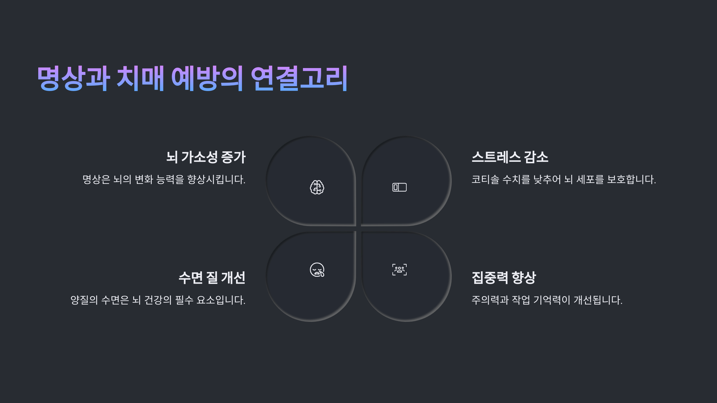 명상은 단순히 눈을 감고 조용히 있는 행위가 아니에요. 뇌를 쉬게 하고 재정비하는 ‘정신의 운동’이라고 볼 수 있어요. 특히 치매 예방에 있어서 명상은 집중력과 감정 조절 능력을 키워주는 효과가 있어요. 요즘은 ‘두뇌 디톡스’라는 말까지 쓰일 정도예요. 🧠