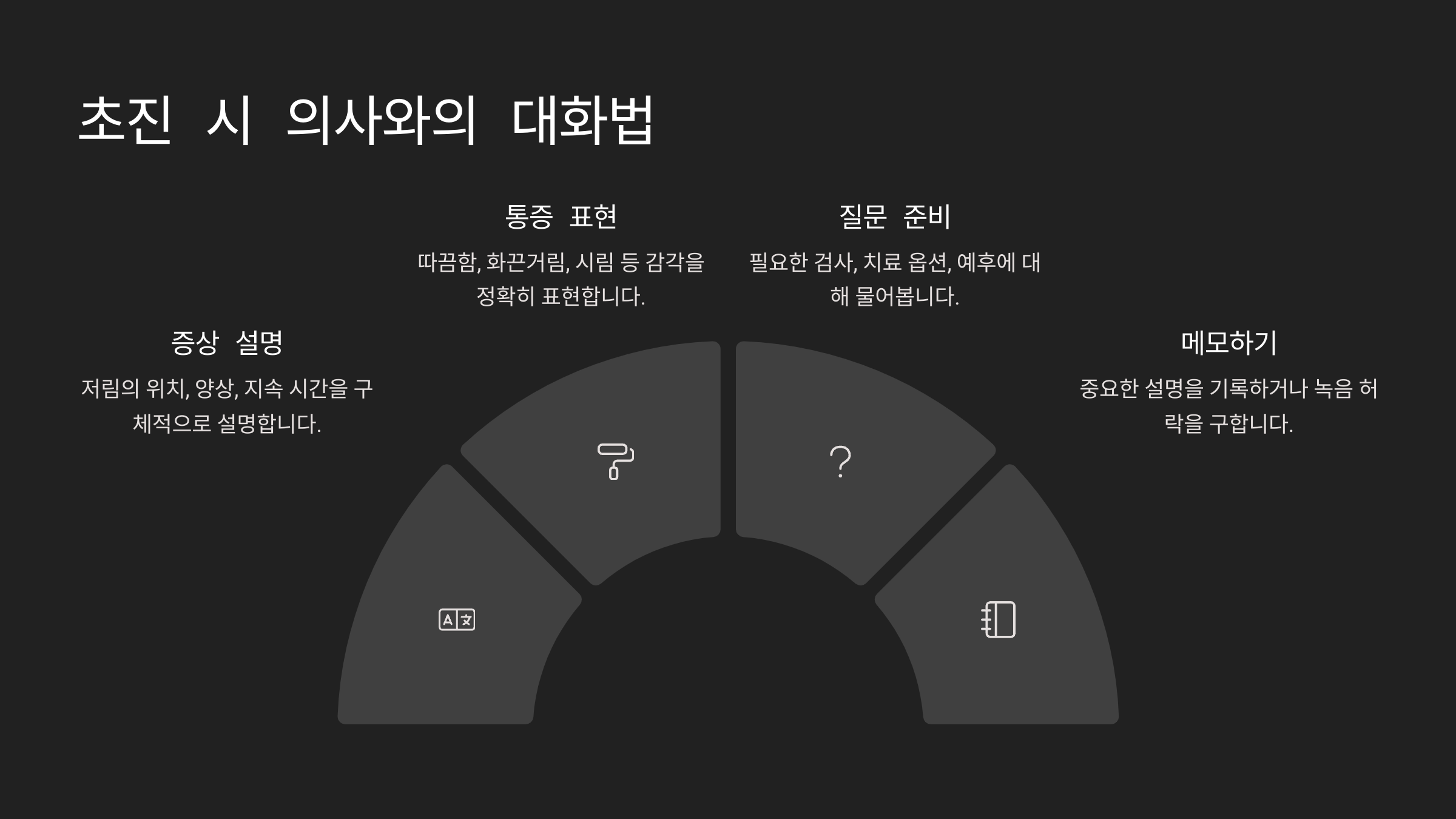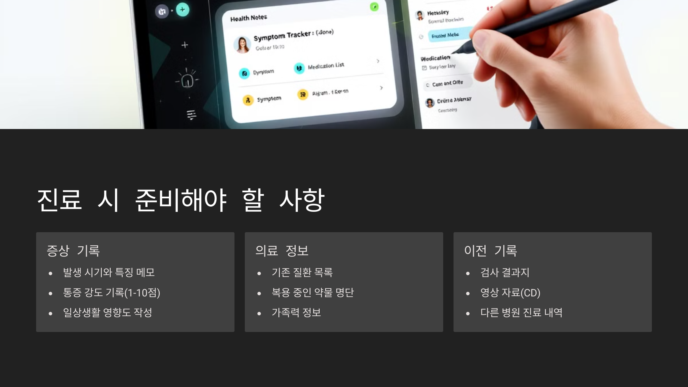 병원을 방문하기 전, 최근 어떤 활동을 했는지, 증상이 언제 시작됐는지, 어떤 상황에서 심해지는지 메모해보면 정확한 진단에 큰 도움이 돼요.