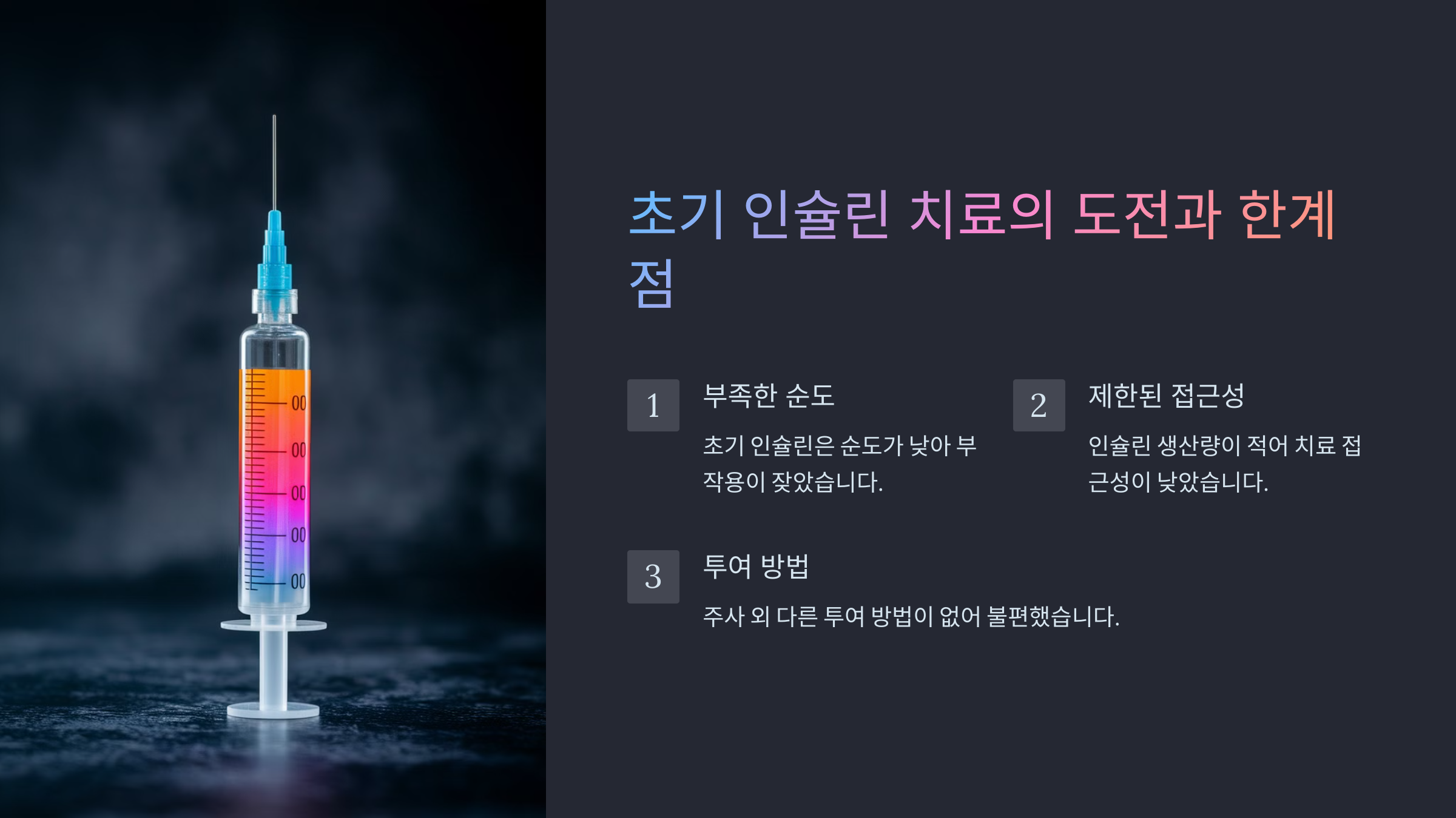 이 연구는 당뇨병 환자들에게 새로운 희망을 주었어요. 이후 인슐린이 대량 생산되면서 당뇨병은 더 이상 치명적인 병이 아니게 되었죠. 하지만 초기 인슐린 치료는 생각보다 많은 문제가 있었답니다. 어떤 문제들이 있었을까요? 다음 섹션에서 알아볼게요! 🚀