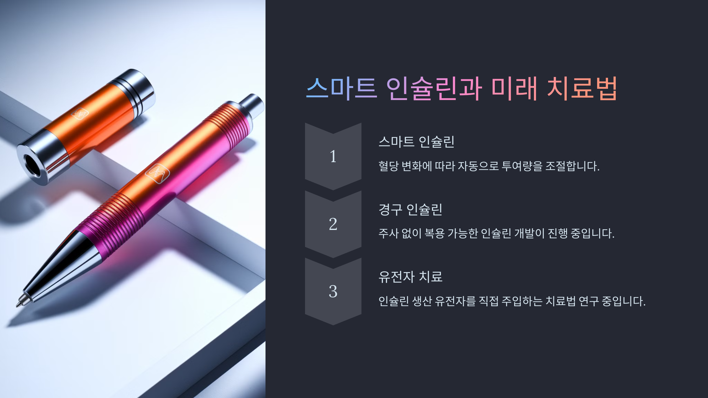 과학기술이 발전하면서 인슐린 치료도 점점 혁신적인 방향으로 나아가고 있어요. 현재 연구 중인 인슐린 기술들은 **주사 없는 치료, 인공지능 기반 혈당 조절, 유전자 치료** 등 다양한 방법을 포함하고 있어요. 미래에는 환자들이 더 이상 주사기를 사용할 필요가 없어질지도 몰라요! 🚀