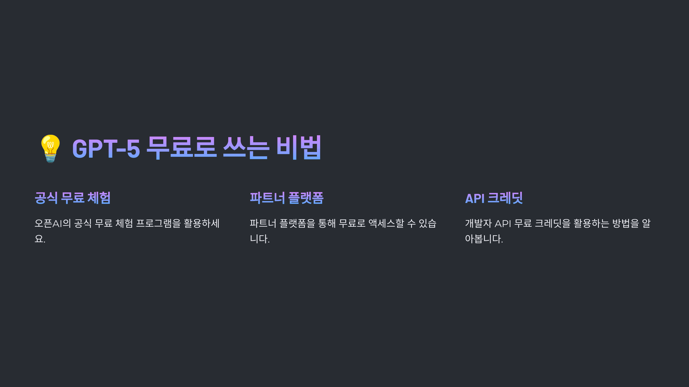 | API 이용 | GPT-5 API를 무료로 제공하는 연구 기관이나 스타트업 활용 | 📊 개발자 및 연구자 |