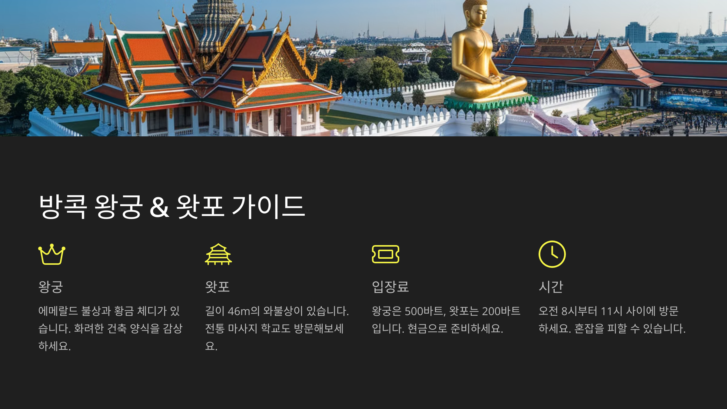 | 방콕 왕궁 | 08:30 - 15:30 | 500바트 | 오전 일찍 (혼잡 피하기) |