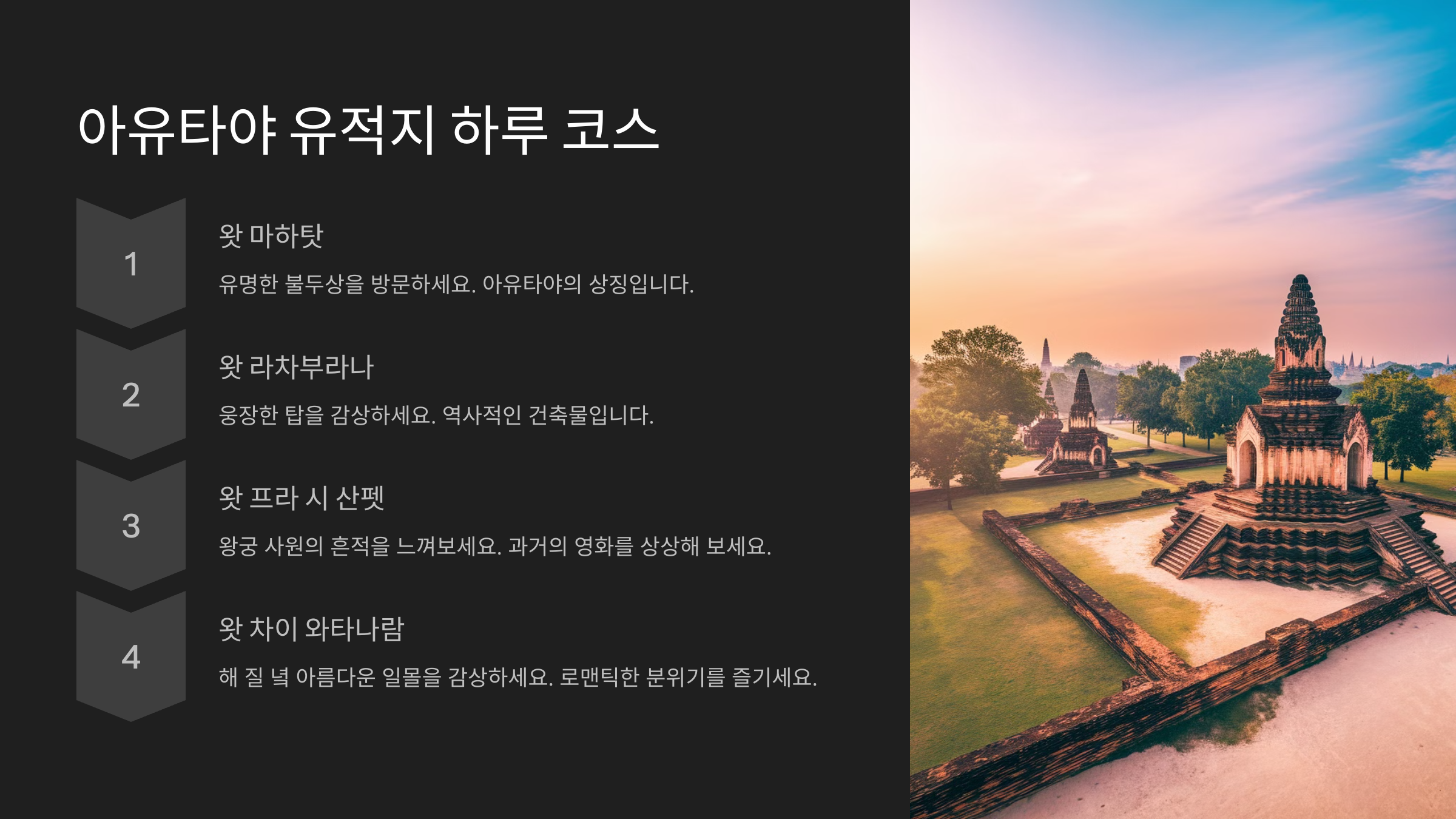 | 14:30 | 왓 차이와타나람 | 석양이 아름다운 사원 |