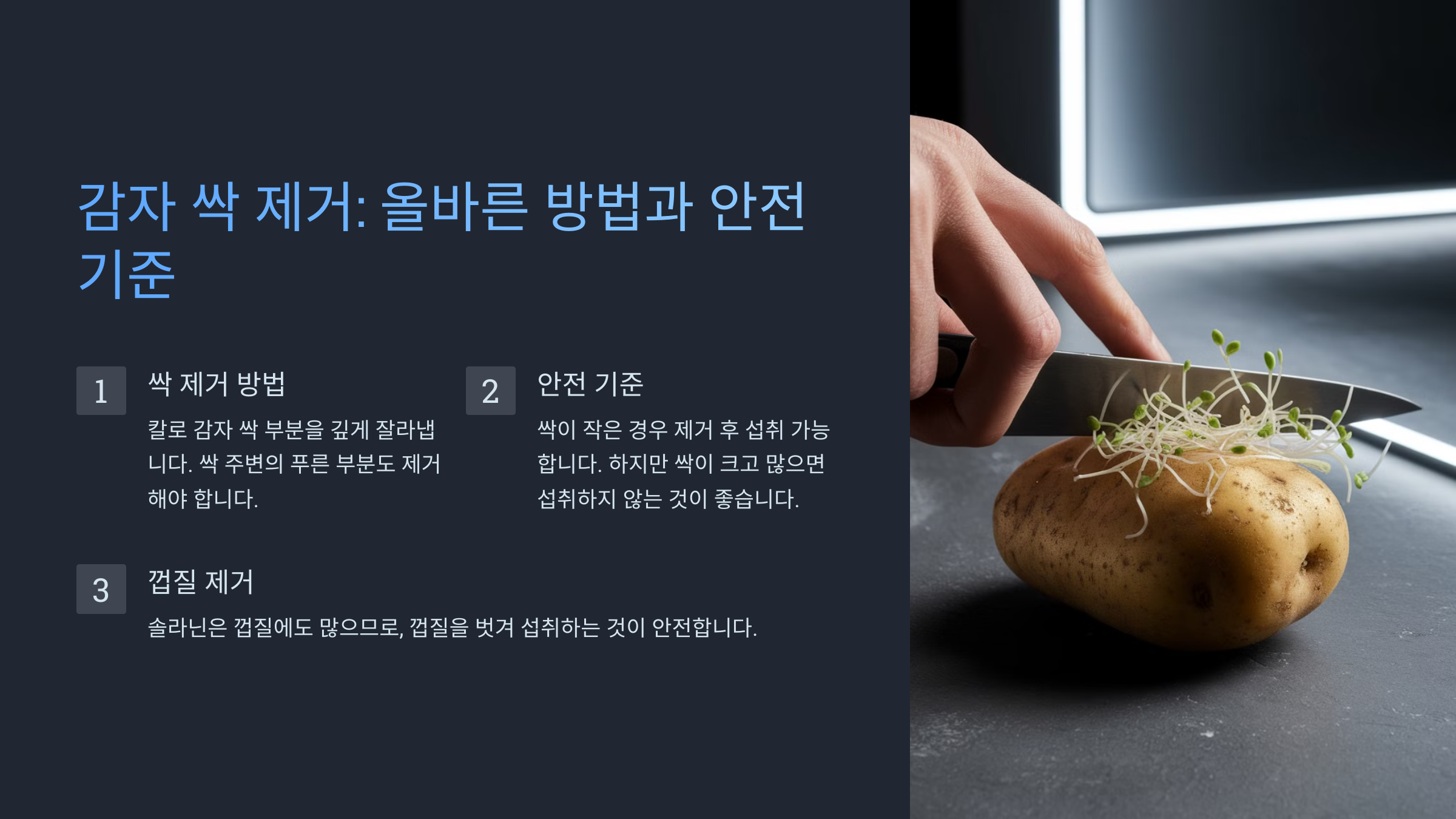 | 싹과 녹색 부분 제거 | 솔라닌 중독 예방 |