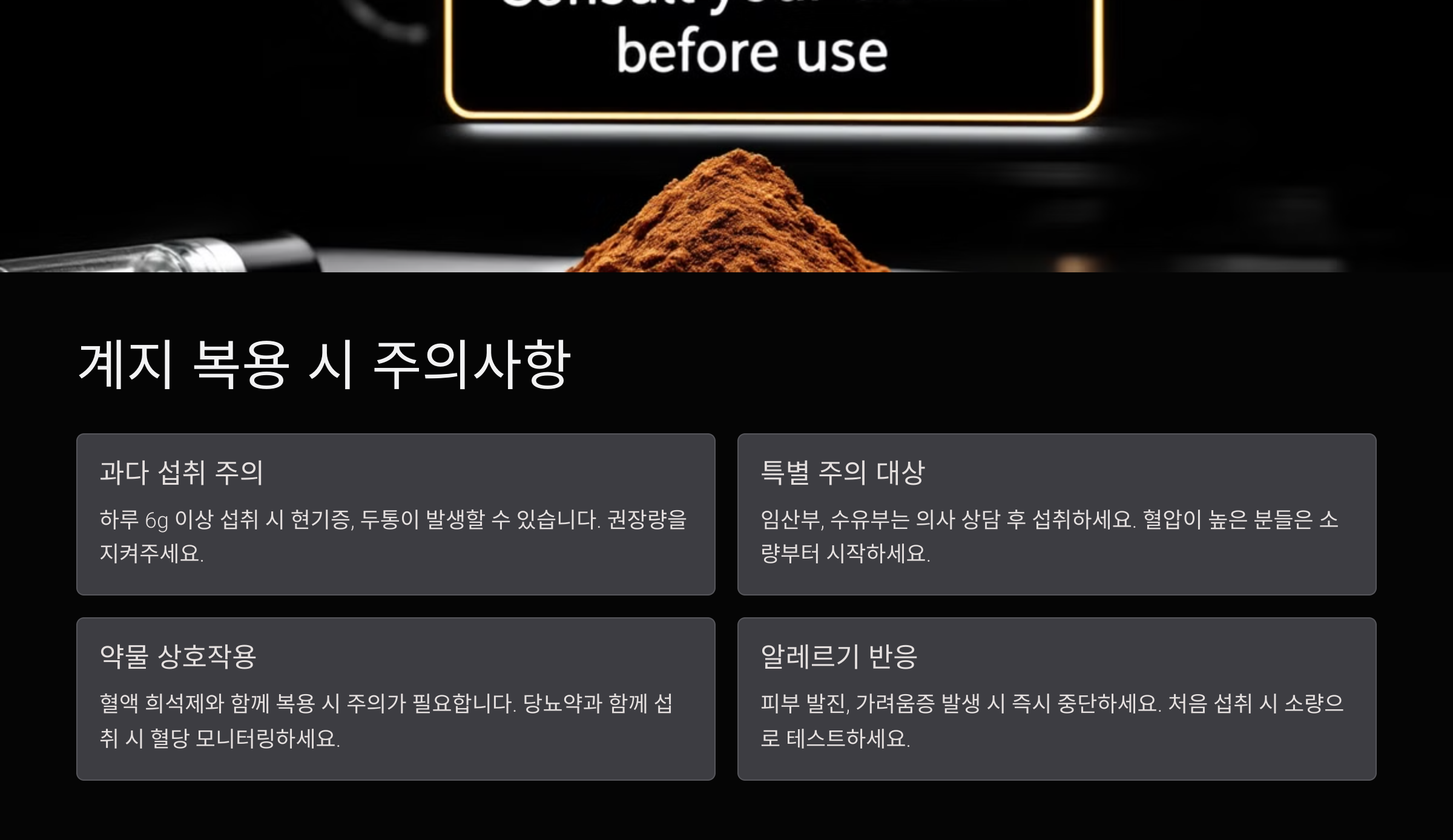 | 열이 많은 체질 | 계지의 따뜻한 성질이 과열 유발 | 복용량 줄이거나 중단 |