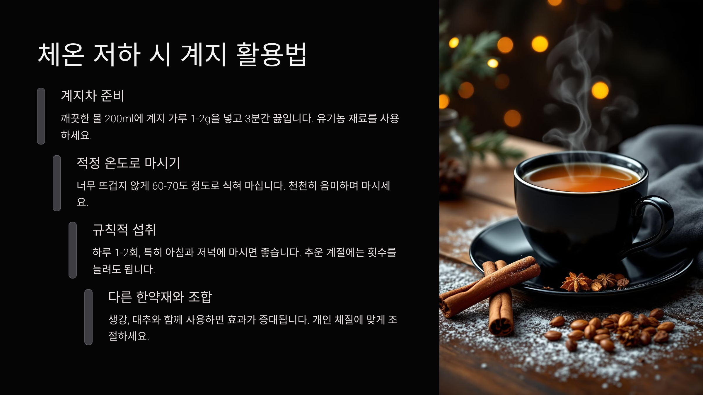 다음은 실제 체온이 낮을 때, 계지를 어떤 방식으로 활용할 수 있는지 구체적으로 알려드릴게요. 🍯