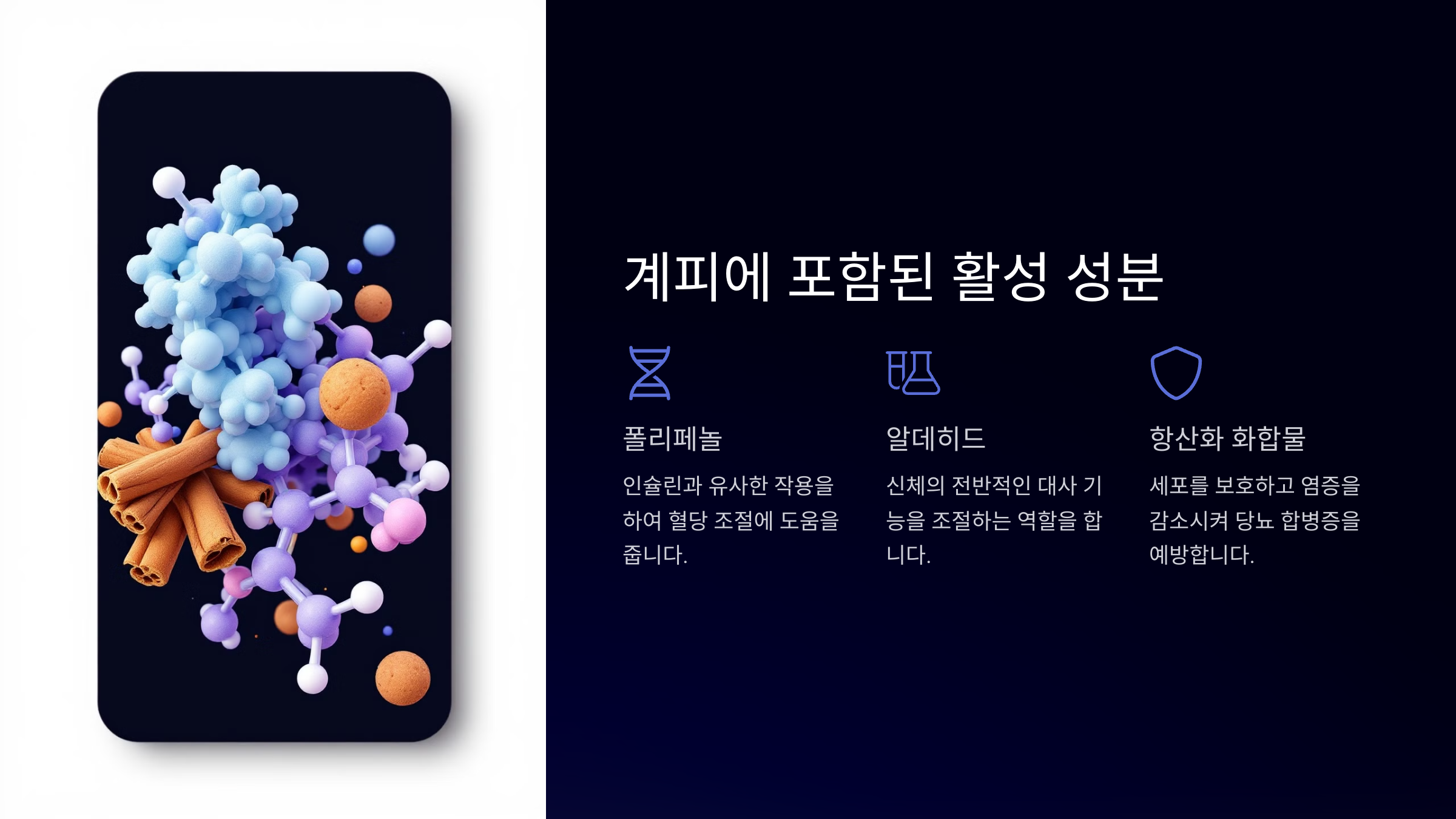 계피의 놀라운 혈당 조절 능력은 그 안에 들어 있는 다양한 생리활성 물질 덕분이에요. 그중에서도 대표적인 성분은 '시나말데하이드(Cinnamaldehyde)'라는 천연 방향족 화합물이에요. 계피 특유의 향과 맛을 내는 주성분이기도 하면서, 항염, 항산화, 항균 작용까지 갖춘 다재다능한 분자죠.