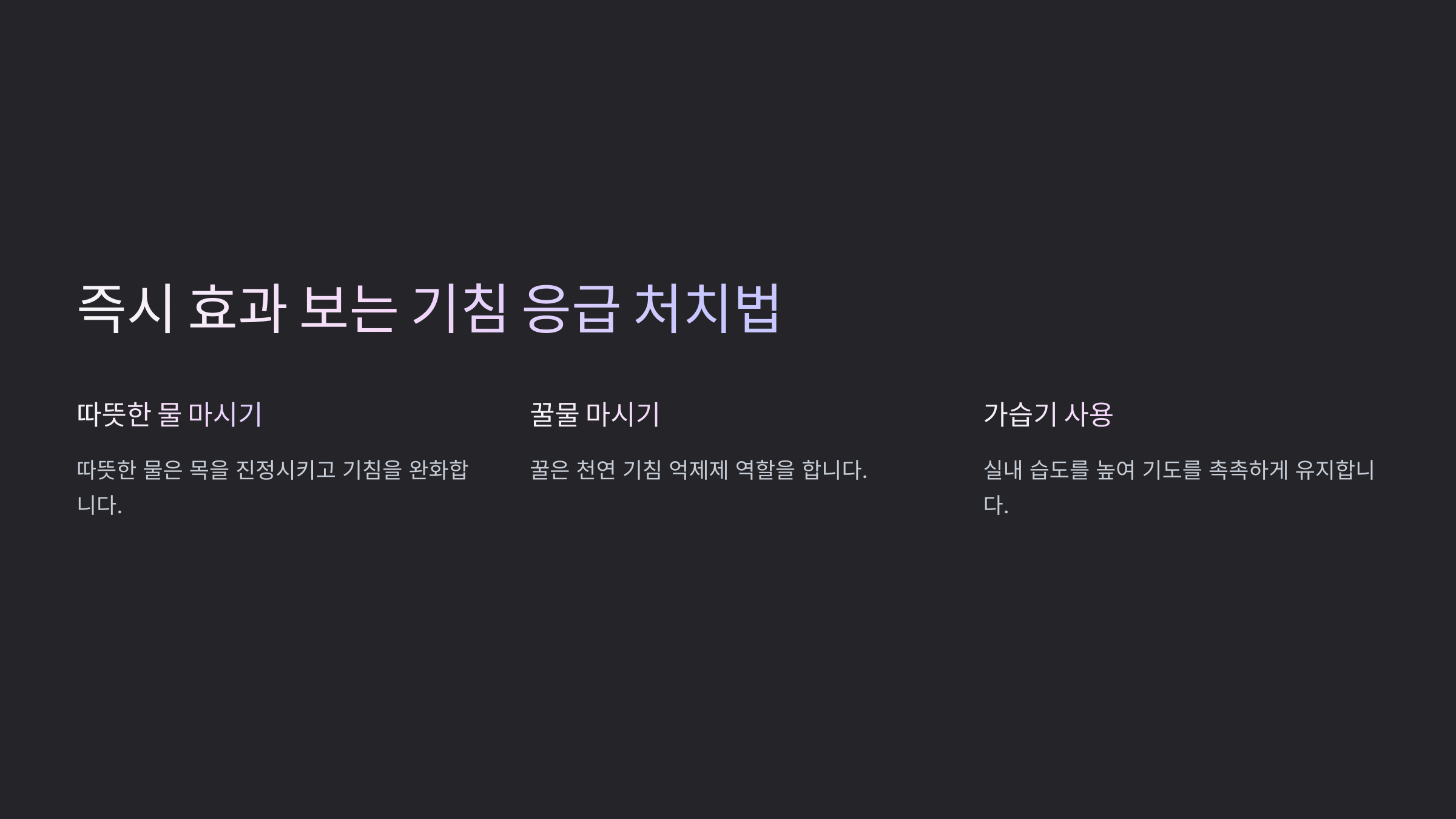 | 마른기침 | 알레르기, 건조한 공기, 바이러스 | 목이 간질거리고 기침이 지속됨 | 따뜻한 꿀물, 가습기 사용, 스팀 흡입 |