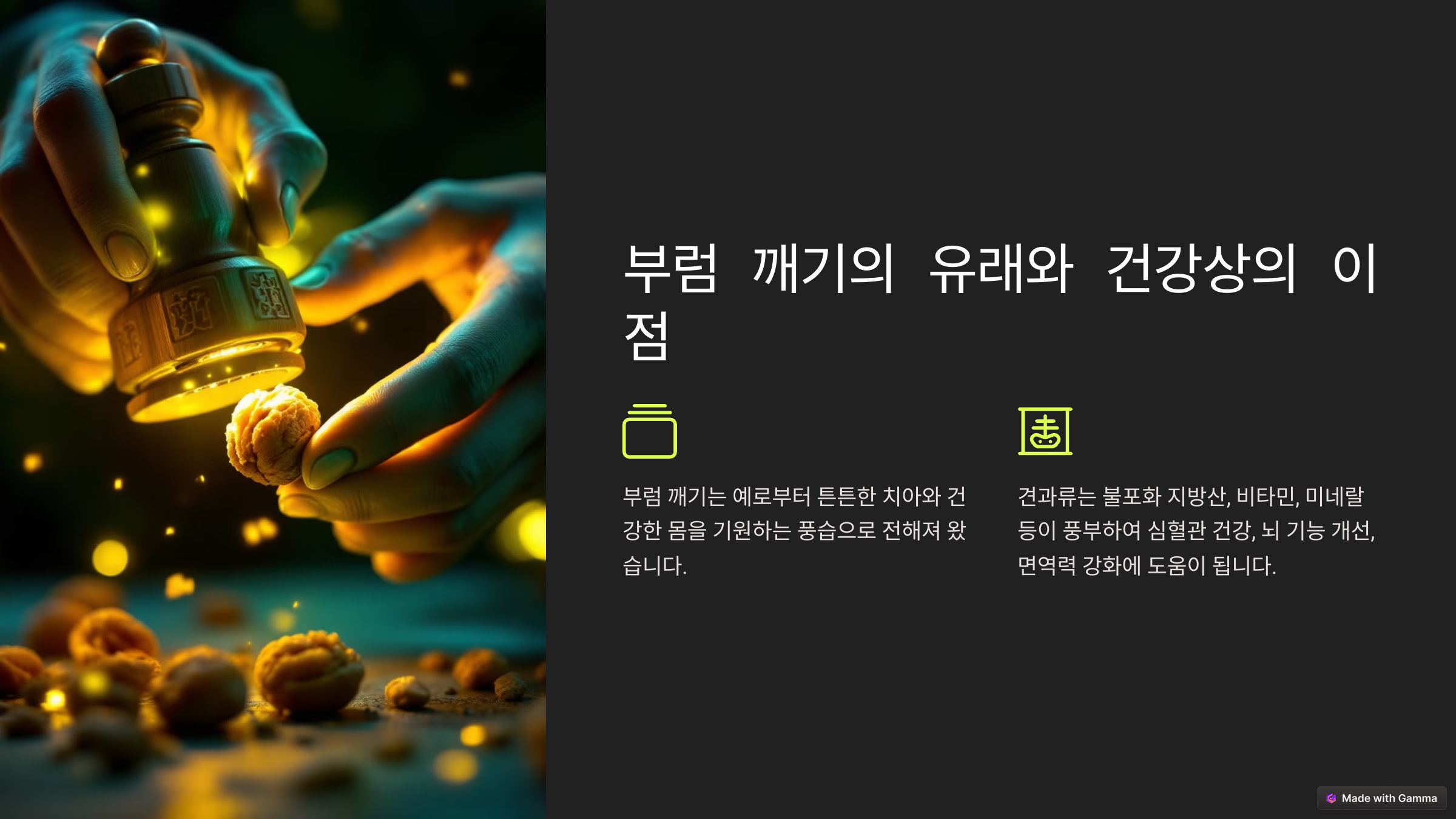 🔮 **액운 방지**: 견과류를 깨는 행위는 나쁜 기운과 액운을 쫓는 의미도 있어요. 이 때문에 가족끼리 아침에 부럼을 깨며 서로 건강을 기원하는 풍습이 전해졌어요.
