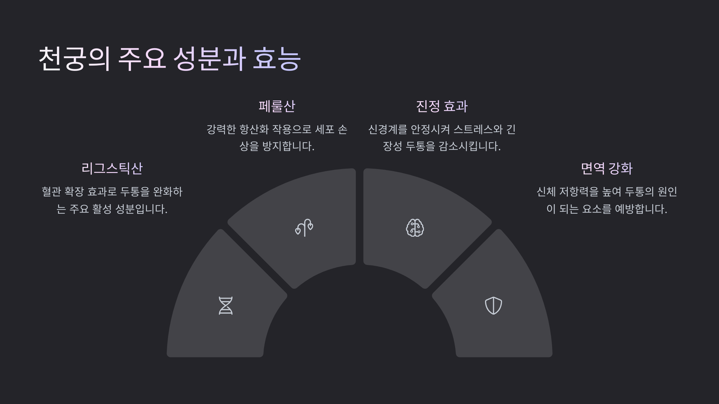 | 부틸프탈리드 | 두통 완화 | 뇌혈류 개선, 산소 공급 증가 |