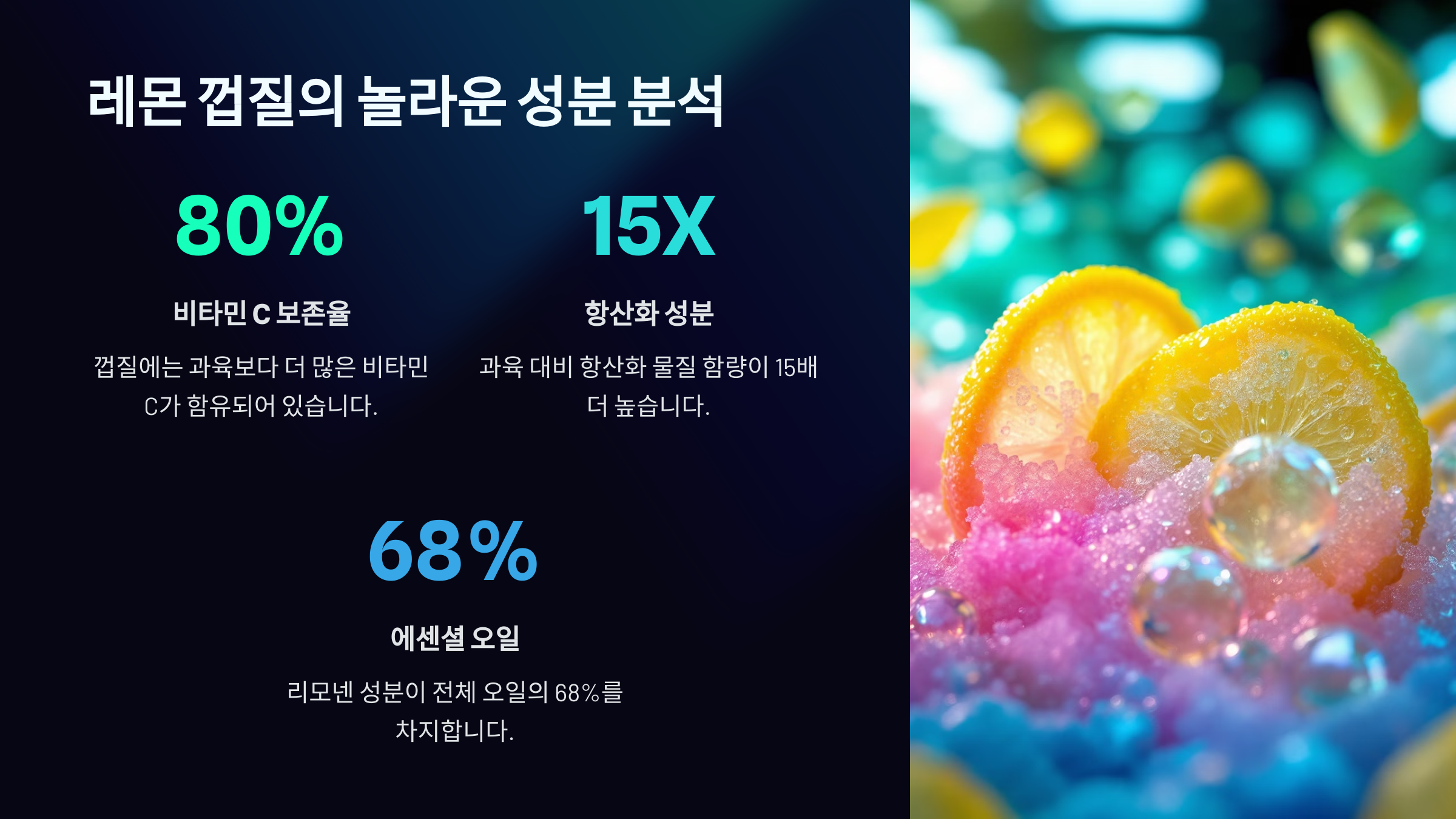레몬 껍질을 이렇게 성분별로 따져보면 그저 버리기엔 너무 아깝다는 생각이 절로 들죠? 게다가 이 모든 성분이 천연 유래라는 점에서 안심하고 사용할 수 있어요!