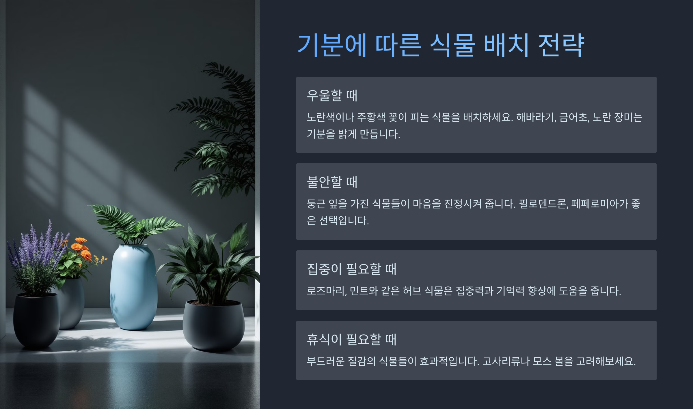사람의 기분은 공간 분위기에 따라 쉽게 바뀌어요. 그렇다면 반대로, 식물을 통해 기분을 조절해볼 수는 없을까요? 사실 충분히 가능하답니다! 기분에 따라 맞춤 식물을 배치하면 나만의 힐링 포인트를 만들 수 있어요.