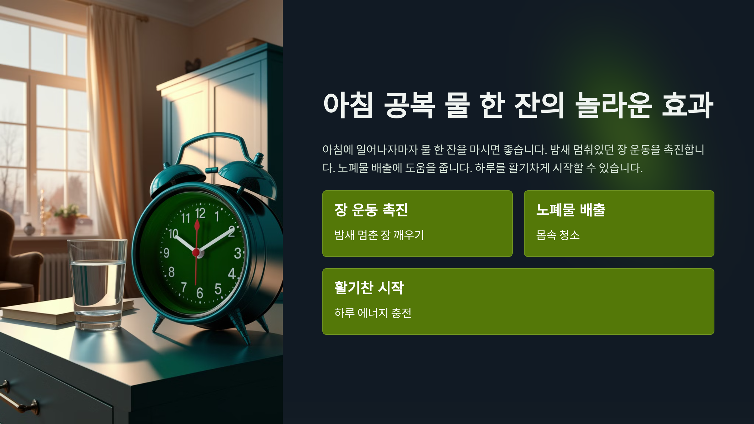 - 아침 기상 직후: 장운동을 활성화하고 배변을 촉진해요.