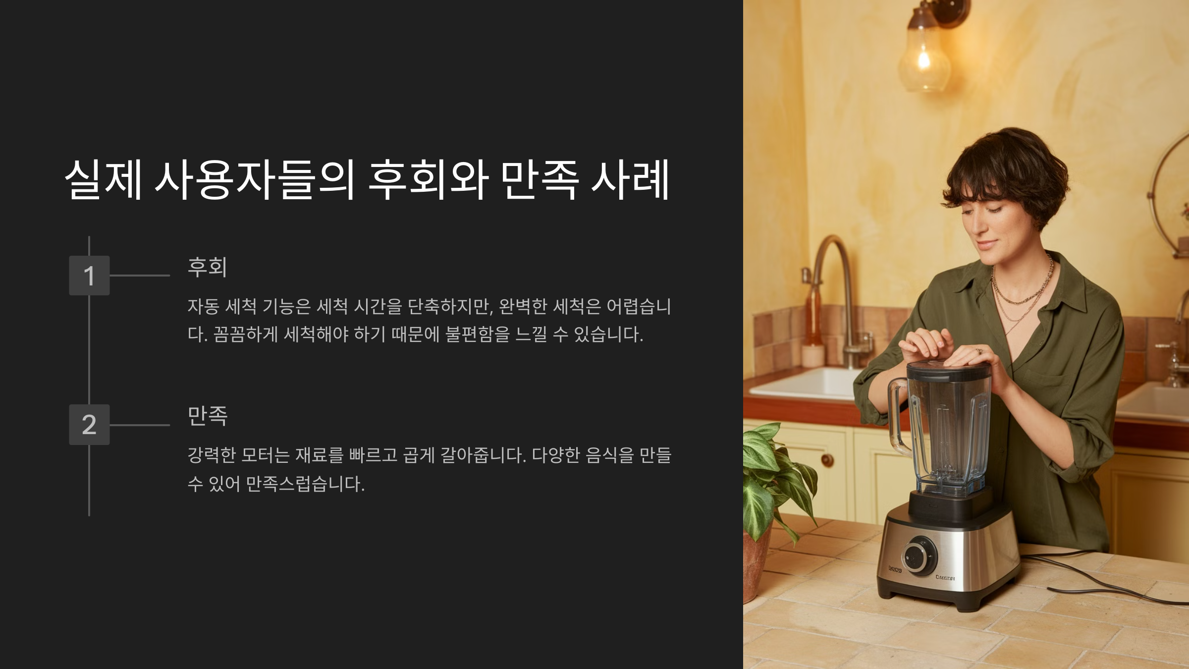 | A사 고급형 믹서기 | ✔ 있음 | 🔵 가벼운 헹굼 필요 |