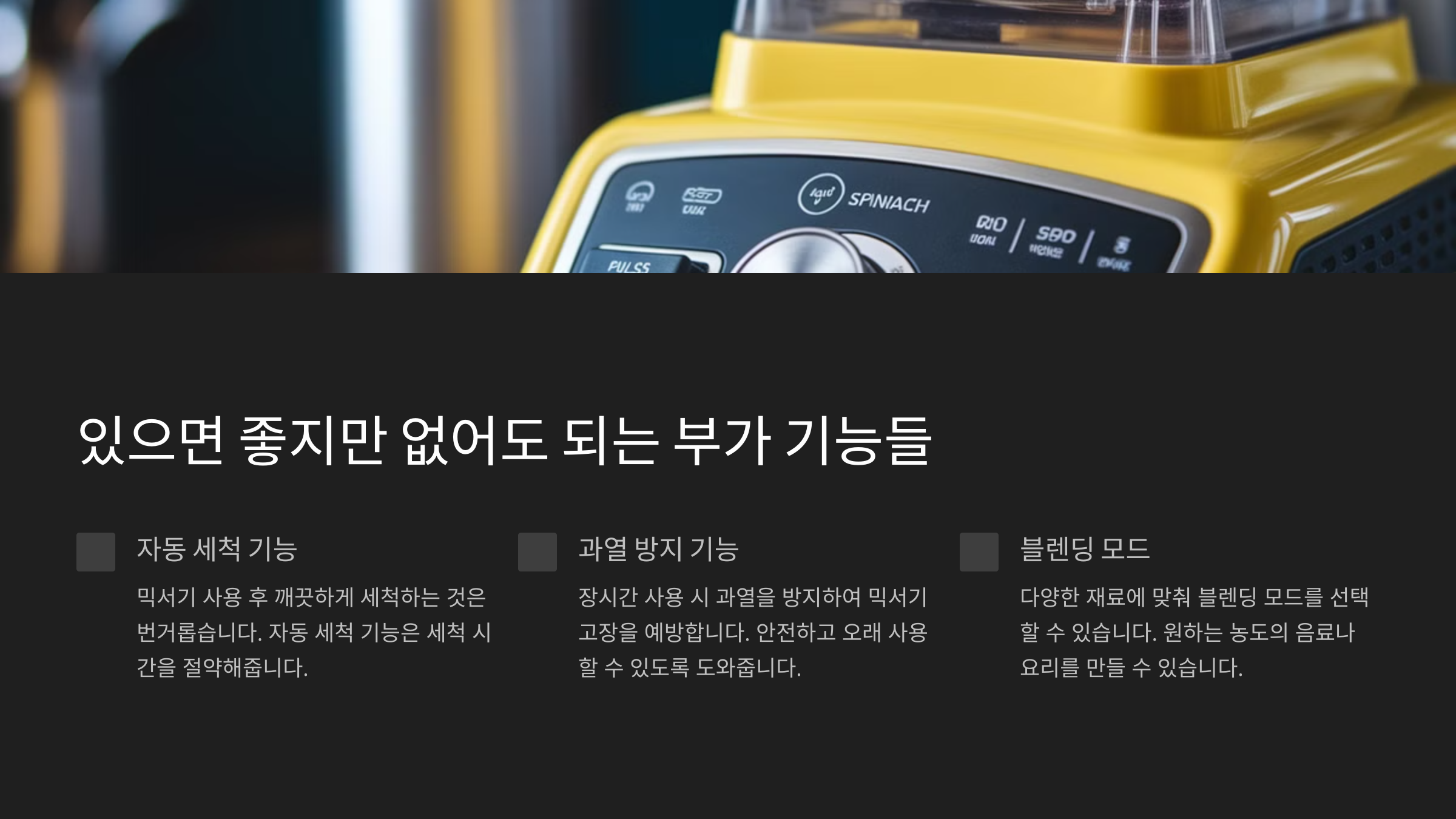 특히 요즘은 여러 가지 부가 기능이 추가된 믹서기들이 많이 출시되고 있어요. 하지만 모든 기능이 꼭 필요한 것은 아니에요. 그래서 오늘은 믹서기를 고를 때 반드시 있어야 할 기능과 없어도 괜찮은 기능을 구분하는 방법을 알려드릴게요. 추가로 자동 세척 기능, 속도 조절, 과열 방지 등 다양한 요소에 대해서도 함께 살펴볼 거예요.