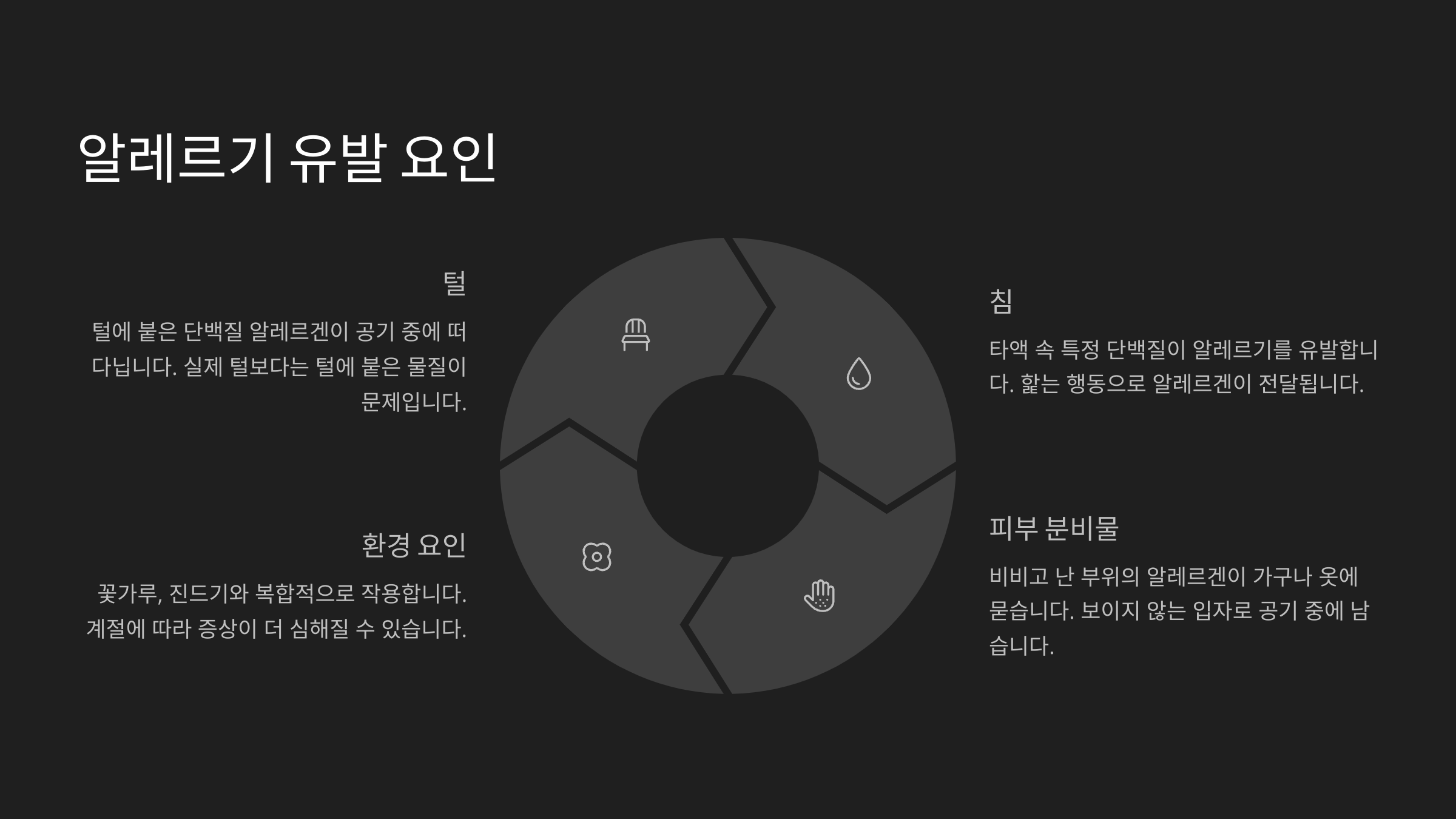 강아지 알레르기는 단순히 '털 때문에 생긴다'고 생각하기 쉬운데요, 사실은 털보다는 그 털에 붙어 있는 '비듬, 침, 소변 성분'이 더 큰 문제예요. 털 자체는 단백질이 적어서 직접적인 원인이 되지 않아요.