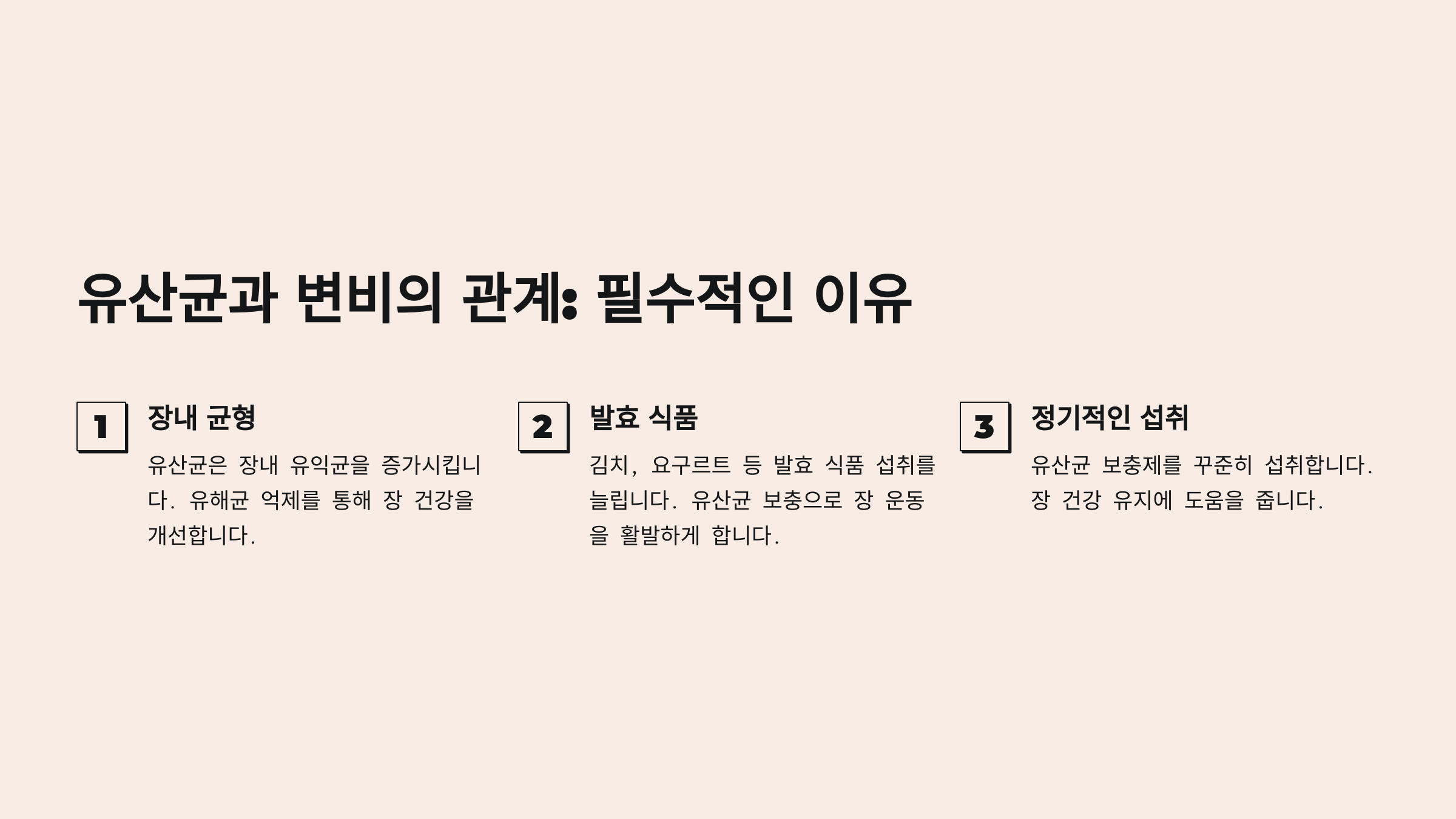 유산균은 장내 유익균을 늘리고 유해균을 억제하는 역할을 해요. 특히 프로바이오틱스가 풍부한 음식을 섭취하면 장 건강을 개선할 수 있어요.