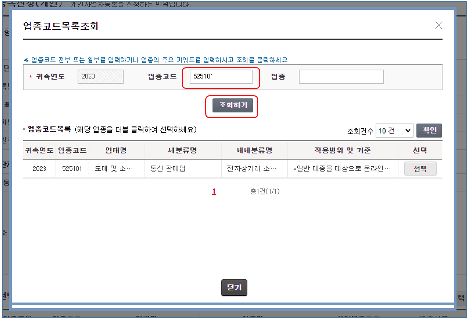 7. 업종코드를 입력하고 조회하기 버튼을 클릭합니다.