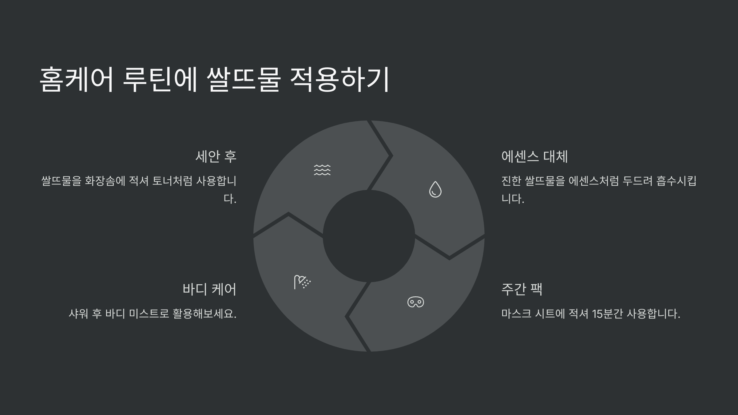 쌀뜨물은 단순히 팩으로만 사용하는 게 아니라 데일리 홈케어 루틴에 다양하게 활용할 수 있어요. 세안, 토너, 미스트, 마스크팩 베이스 등으로도 변신이 가능하답니다. 특히 아침이나 저녁 루틴에 자연스럽게 끼워 넣으면 피부 컨디션이 전체적으로 안정돼요.