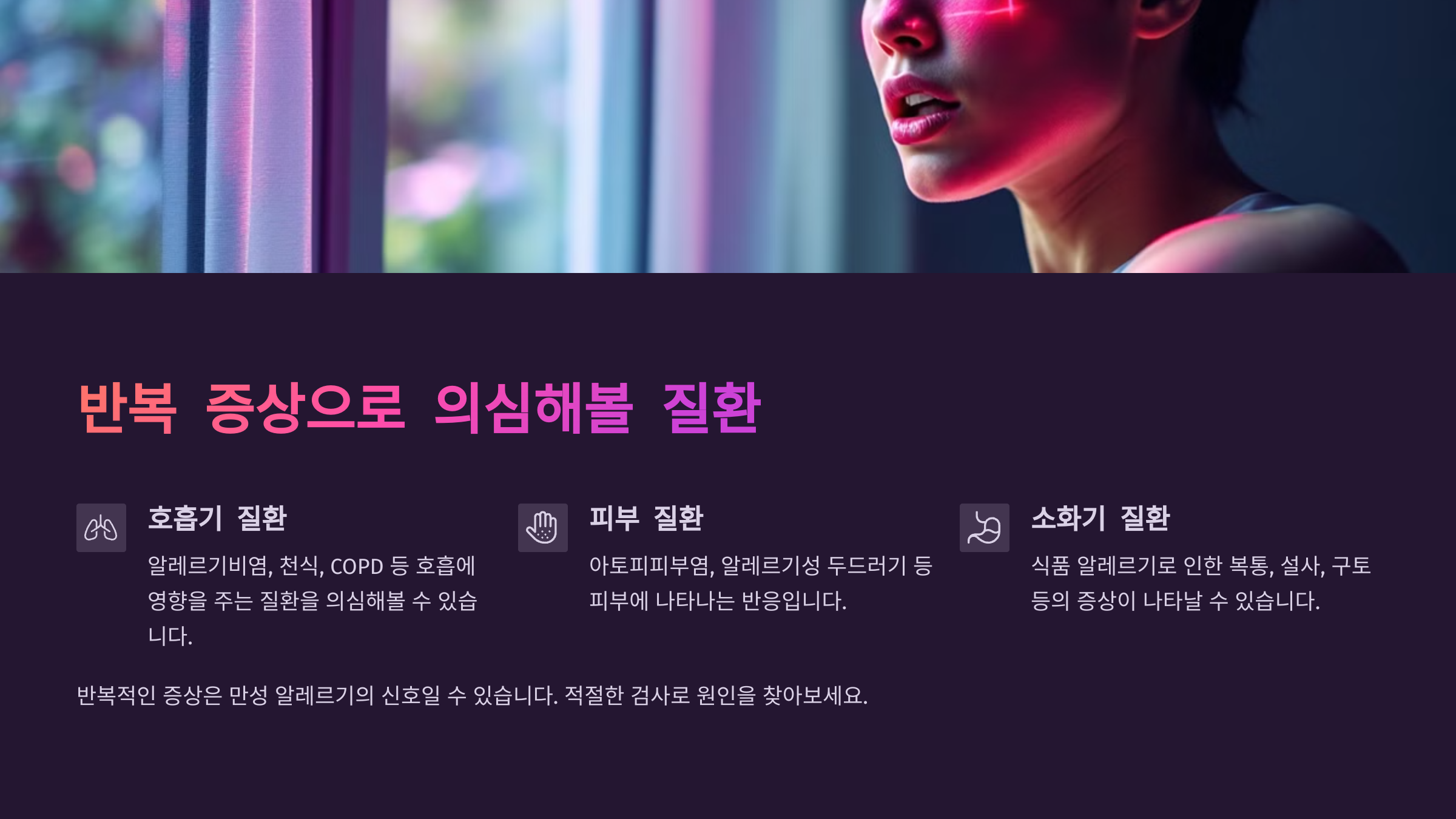 이제 반복되는 증상에서 알레르기를 의심해야 할 질환들을 소개할게요. 자꾸 비슷한 증상이 나타난다면 이 섹션을 주목해 주세요! 🔁