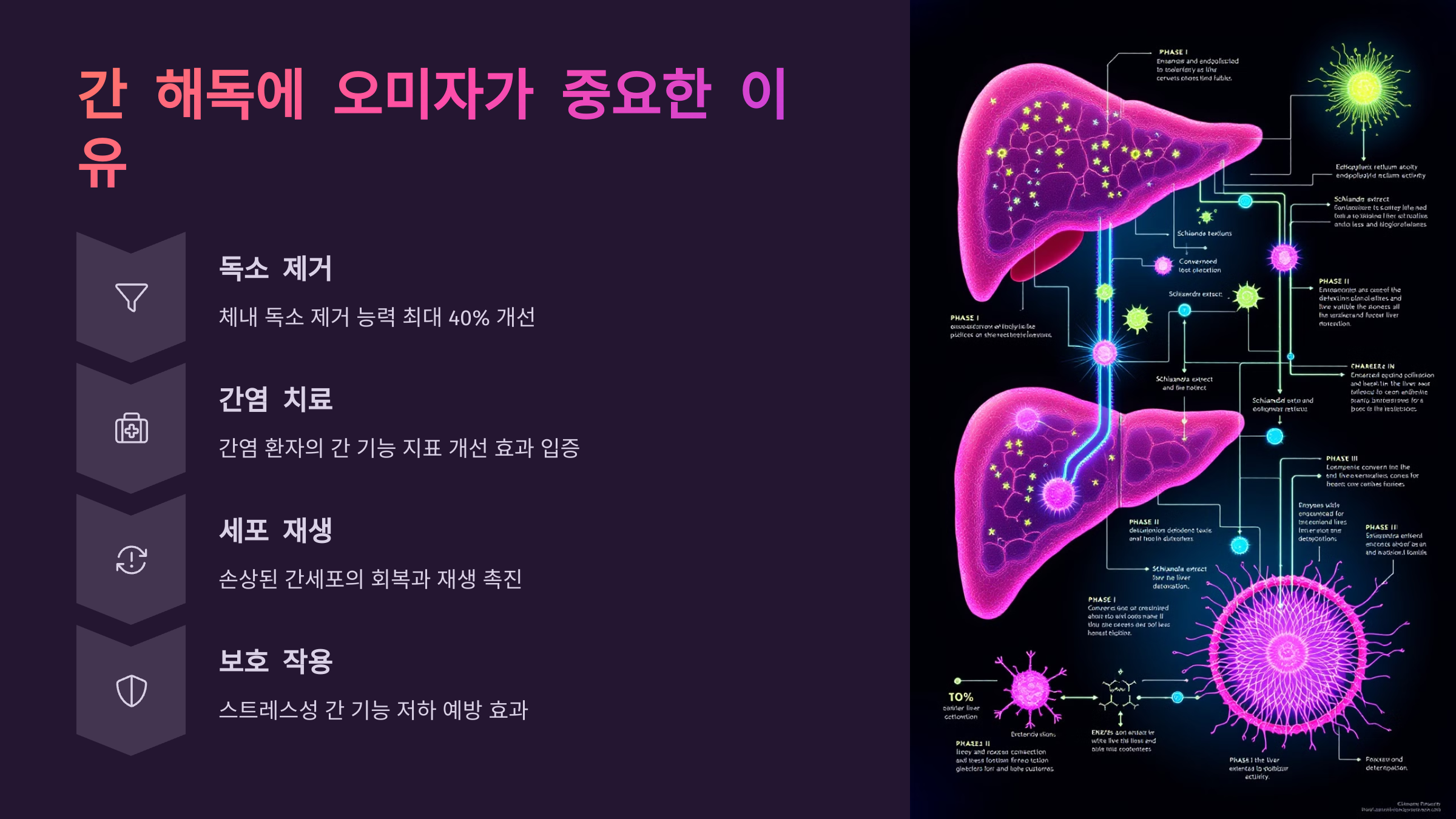 특히 쉬잔드린 A, B, C 같은 성분들은 간에서 독소를 중화시키는 효소들의 활동을 증가시켜줘요. 이 효소들은 간에서 알코올, 환경 호르몬, 약물 등의 유해물질을 분해하고 배출하는 데 핵심 역할을 해요.