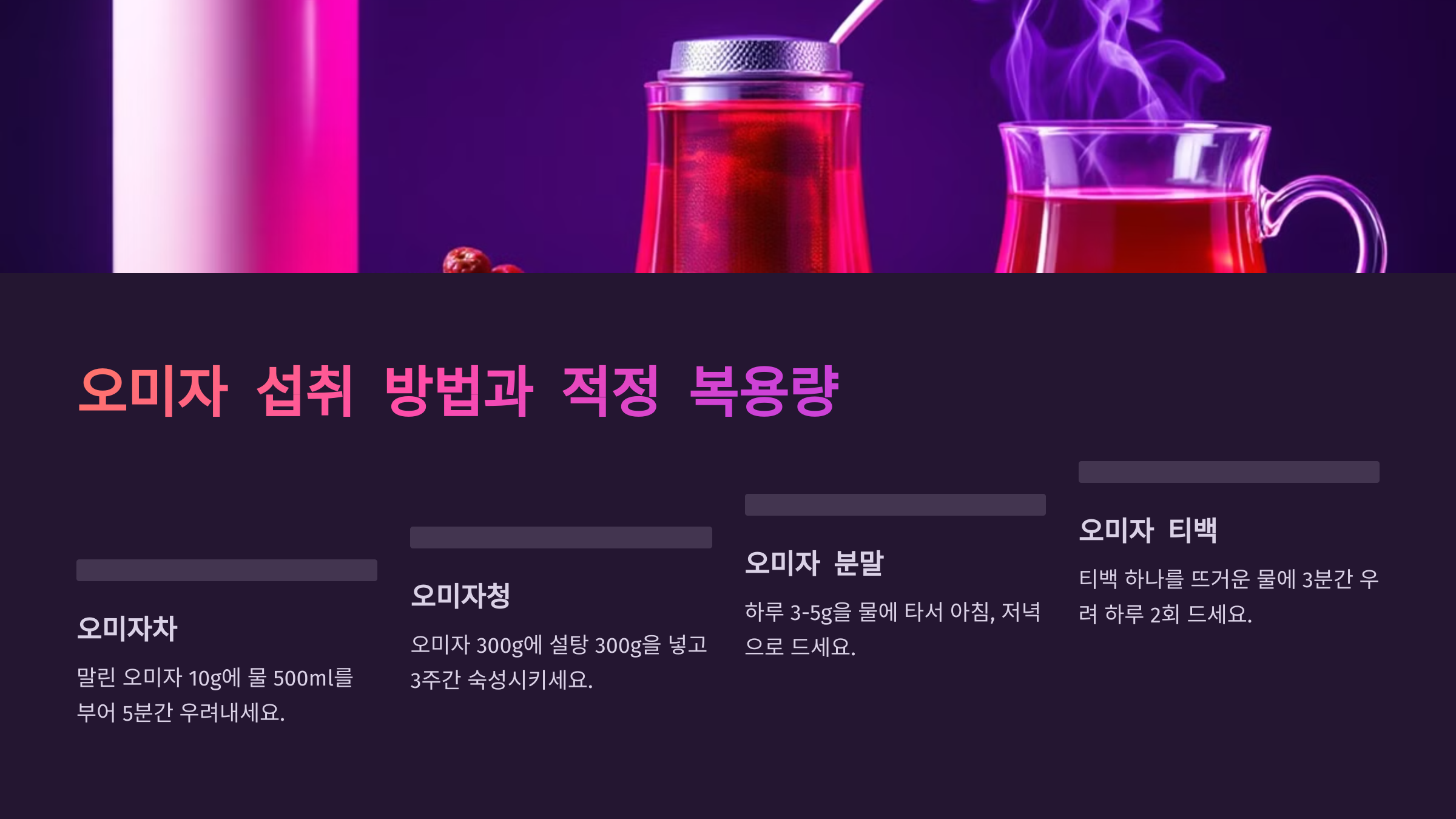 다음은 오미자를 어떻게 섭취하면 가장 효과적인지, 복용량은 어떻게 조절해야 하는지 알려줄게요!