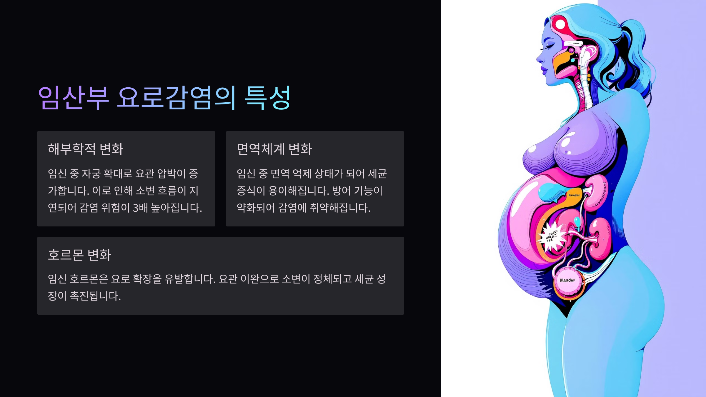 또한 임신 후반기에는 자궁이 방광을 압박하게 되어 잔뇨가 생기고, 그 결과 세균이 쉽게 번식할 수 있는 환경이 조성돼요. 이로 인해 임산부는 일반 여성보다 요로 감염에 더 취약한 상태가 되지요.