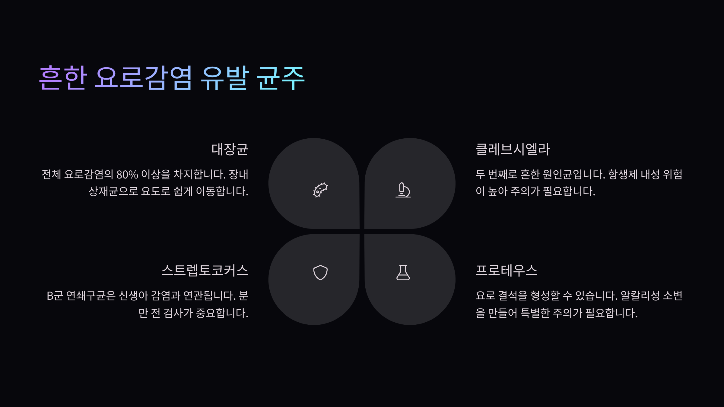 | Klebsiella | 요로 | 병원 감염에서 자주 발견 |