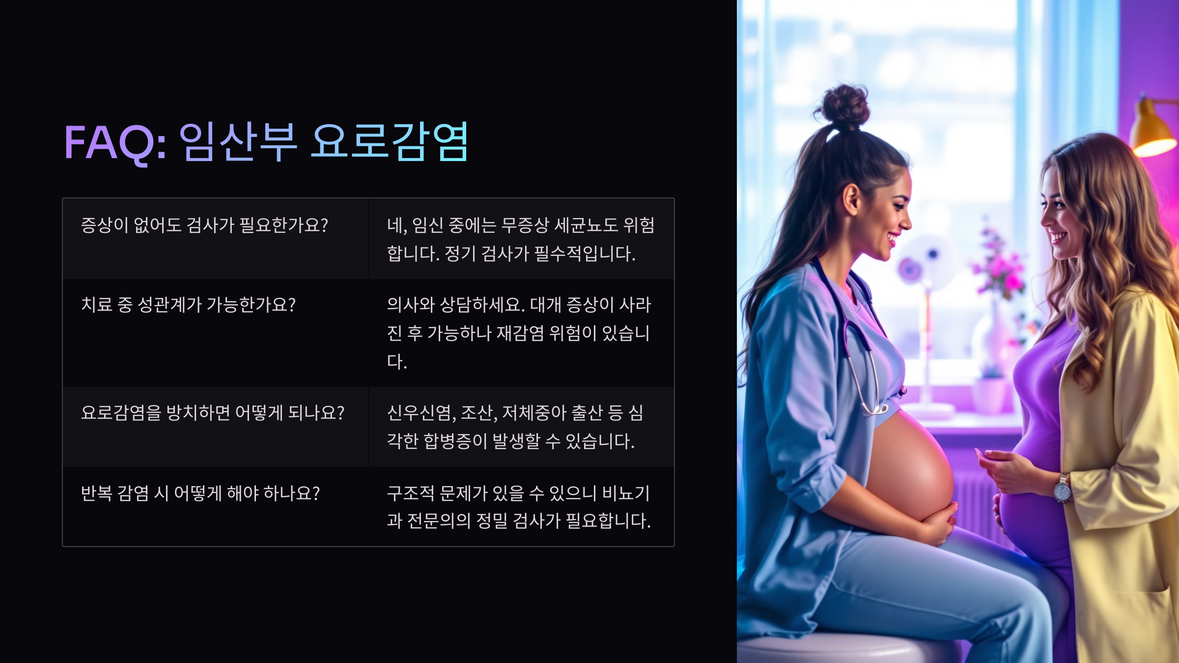 A8. 기본적으로 산부인과 진료를 보시고, 필요시 감염내과나 내과 협진이 진행돼요. 단독 진료보다 협진이 훨씬 안전해요!
