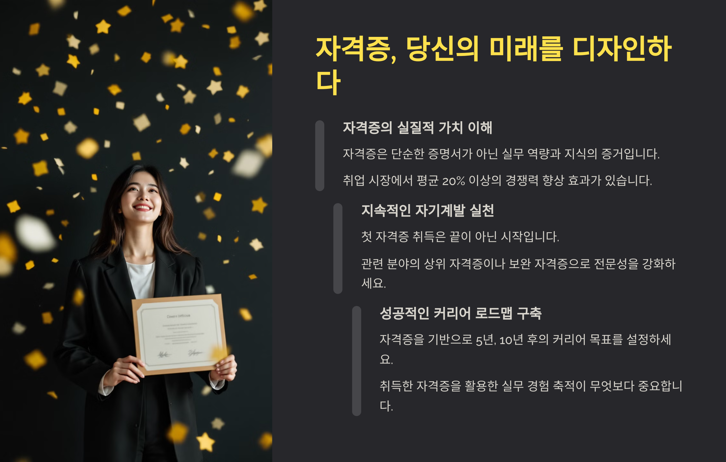 이처럼 자격증은 단순히 취업을 위한 수단이 아니라, 나 자신을 증명하고 성장시키는 멋진 도구예요. 그래서 많은 사람들이 시간과 노력을 들여서 자격증을 취득하고, 자신의 커리어를 한층 업그레이드하고 있답니다.