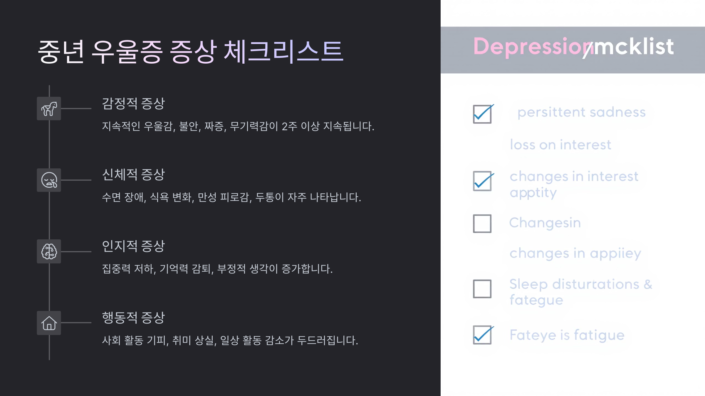 중년 우울증은 겉으로 보기엔 티가 잘 나지 않을 수 있어요. 하지만 마음속에서는 여러 감정의 물결이 몰아치고 있을 수 있답니다. 아래 체크리스트를 통해 스스로의 상태를 점검해보는 것이 중요해요.