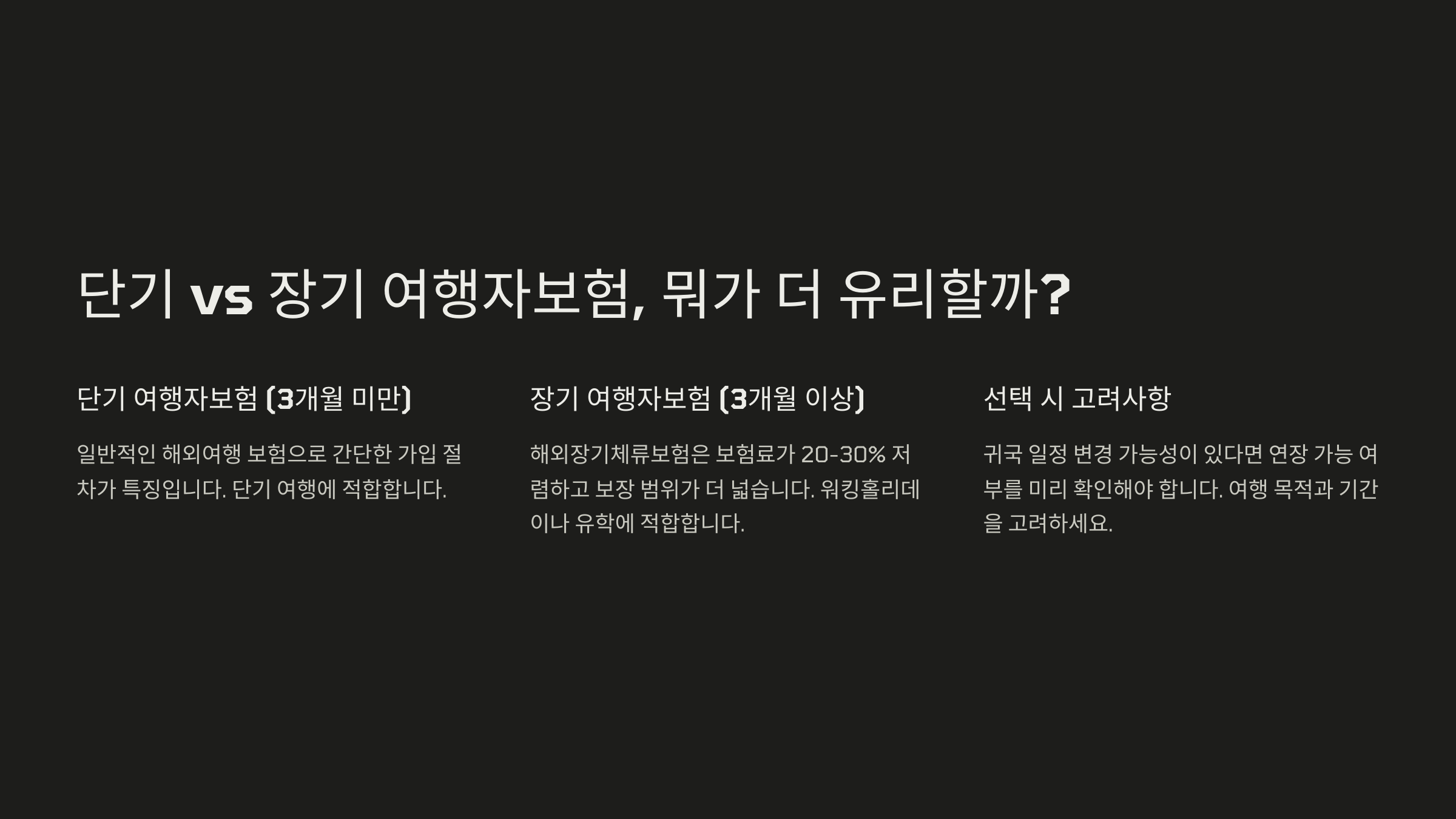 이처럼 여행 기간에 따라 보험을 선택하는 것이 중요해요. 짧은 여행이라면 단기 보험으로 충분하지만, 3개월 이상 머문다면 장기 보험을 고려하는 게 좋겠죠? 😉